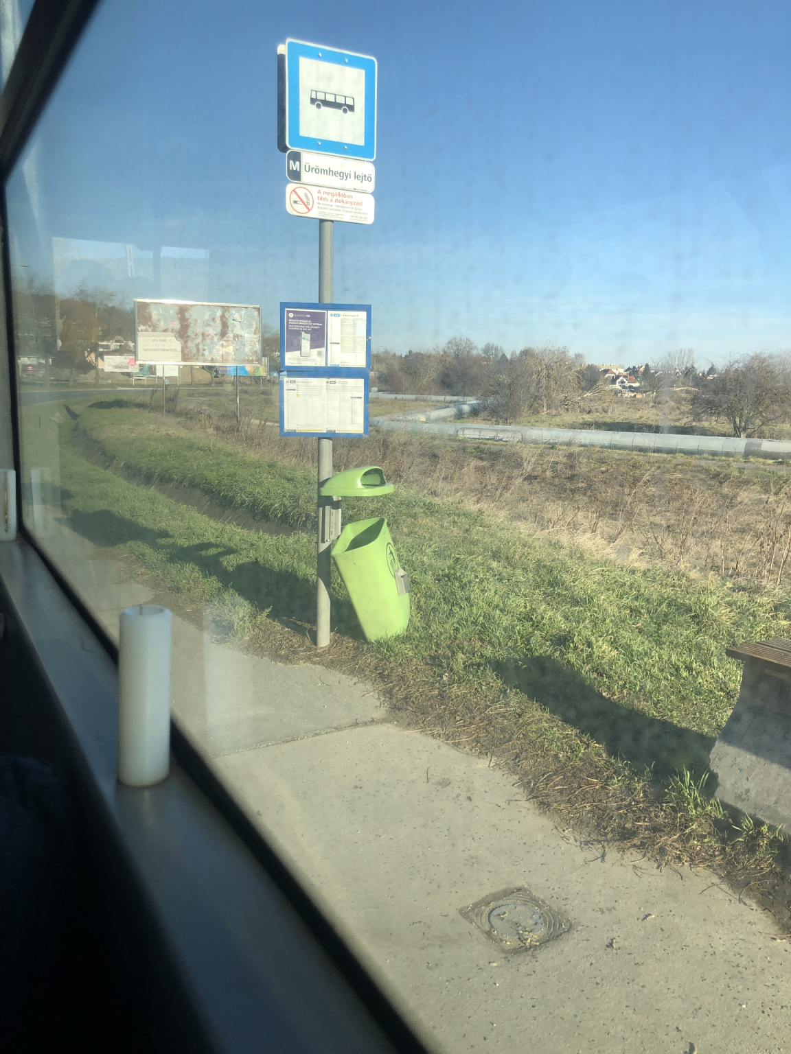 Az Ürömhegyi lejtő buszmegállóban egy kuka szétesett.