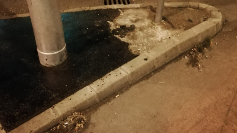 Budapest, Kőbánya, Liget tér-Kőrösi Csoma út kereszteződésnél, ahol a zebra indul a villamosmegálló felé, a lámpát, jelzőlámpákat rendbe hozták egy ütközés után, de a kis járdaszigetet, amin ez található, sajnosa csak félig.... Ősszel aszfaltozták le a járdaszigetet, de éppen elfogyott az aszfalt.... így félig úgy maradt, félmunka...Kérjük egészen leaszfaltozni, rendesen! Köszönjük!