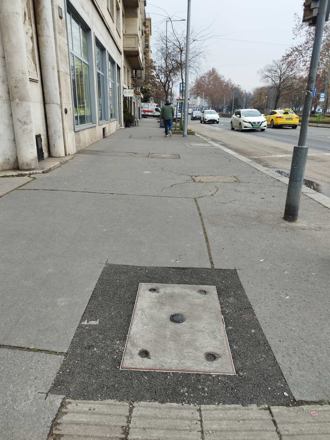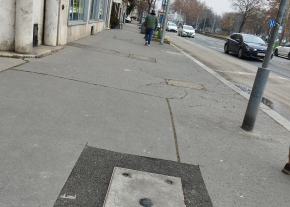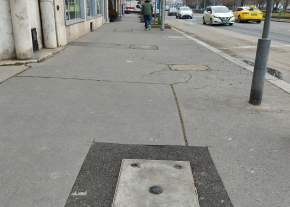 A Zsil utcánál, a gyalogátkelőnél lévő kisméretű fedlap oldalirányban megdőlt és megsüllyedt a járdával együtt.