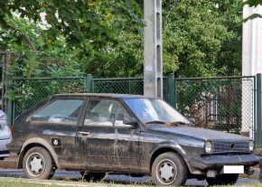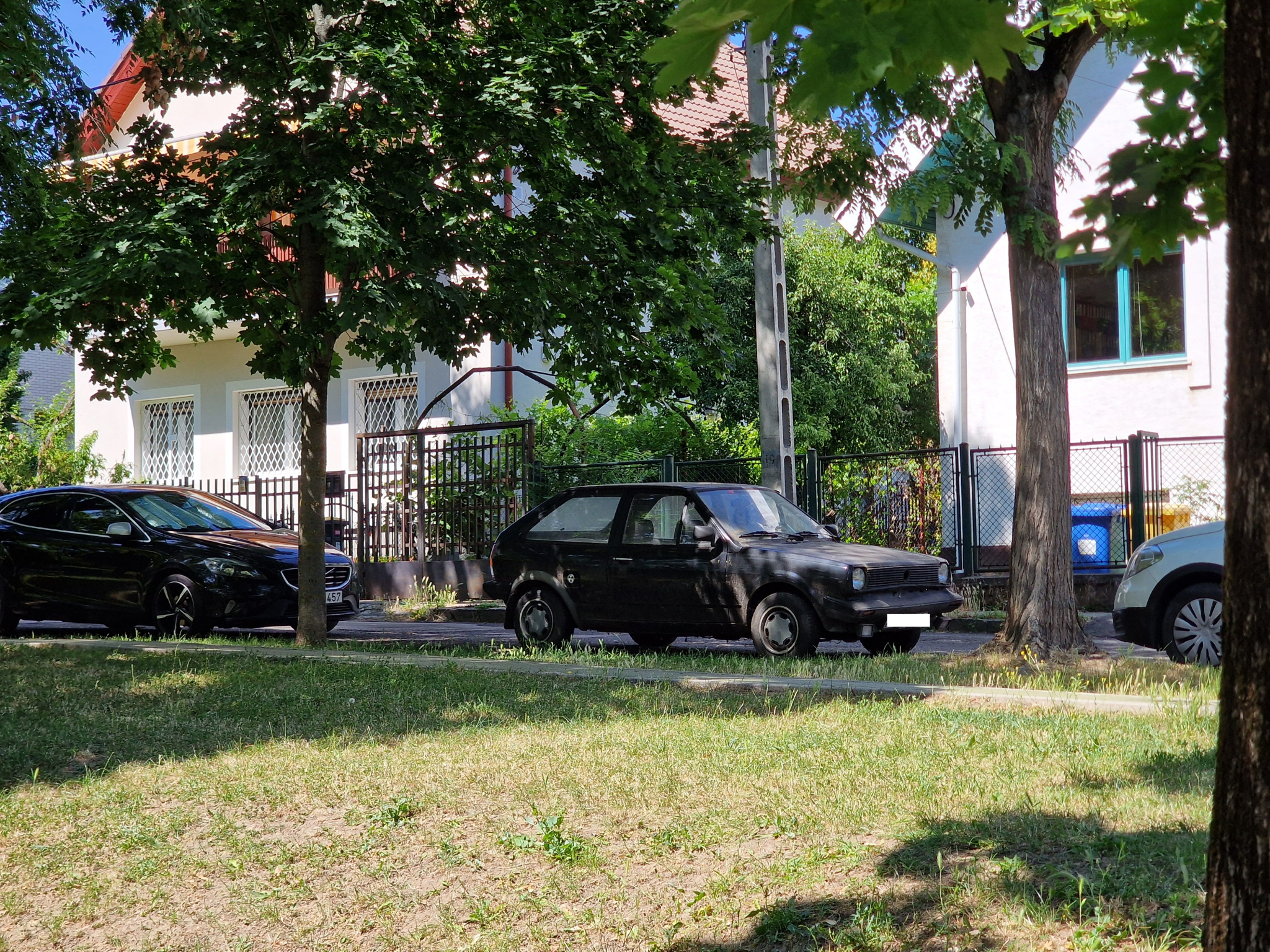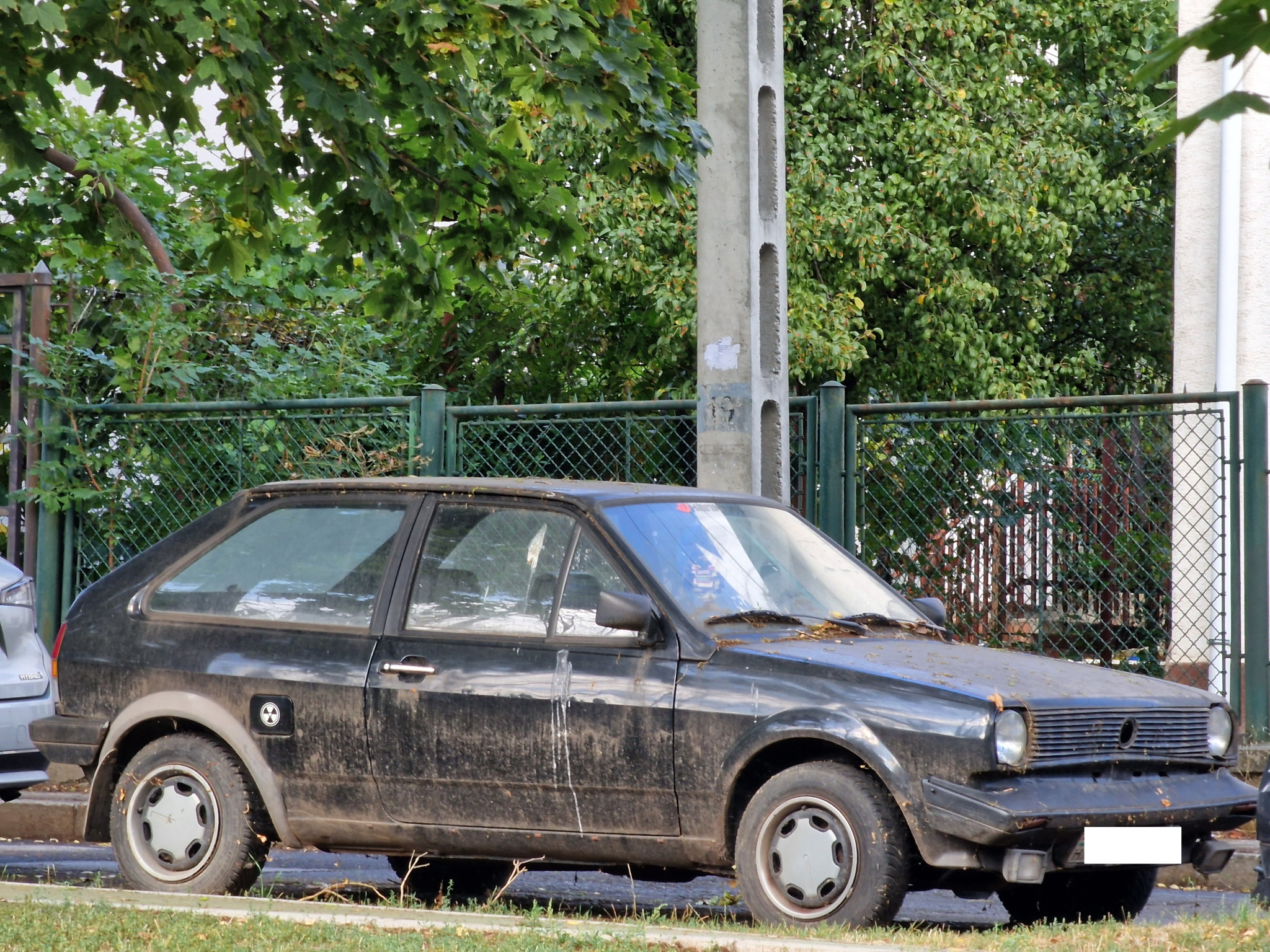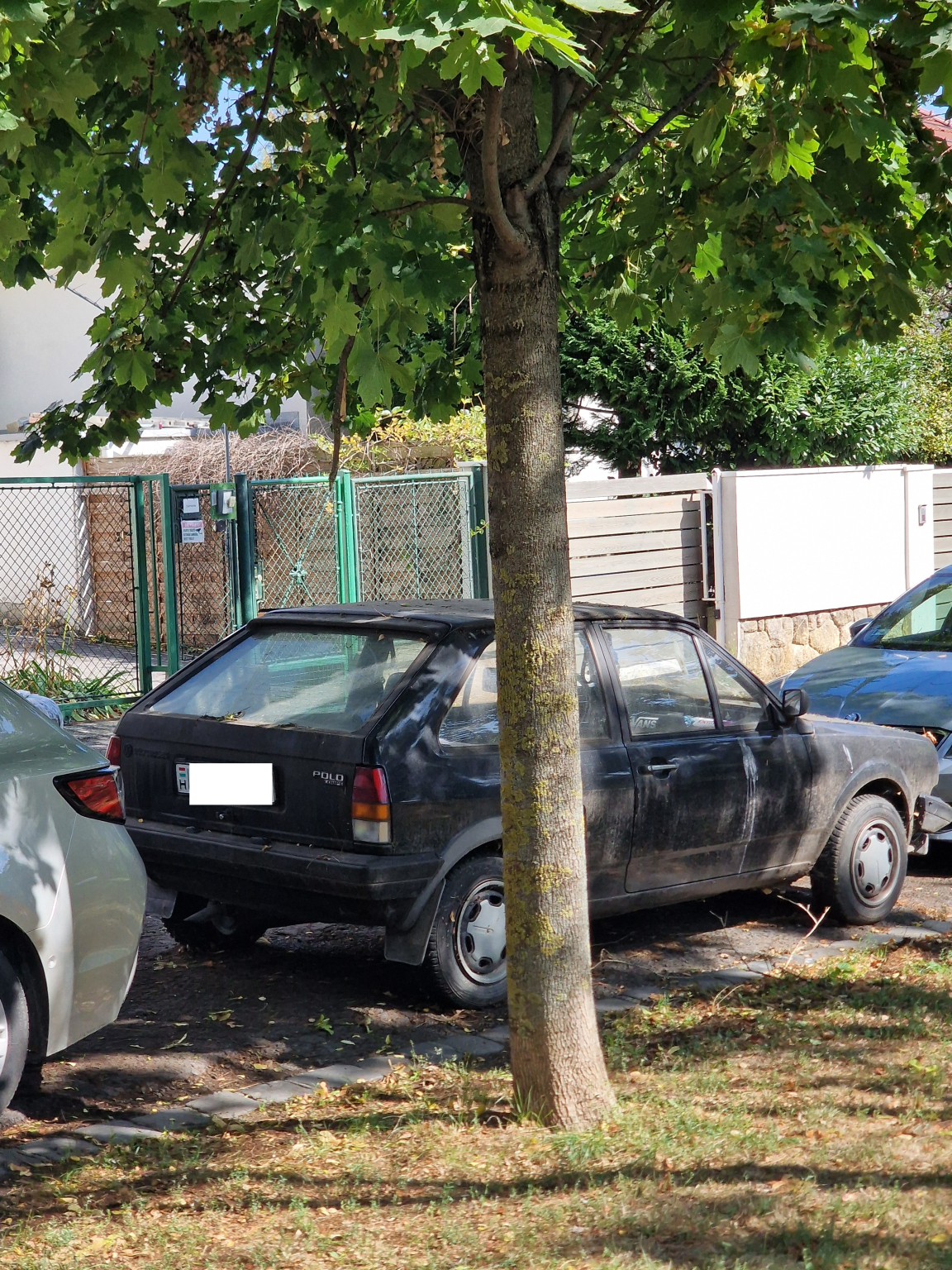 1983-as fekete Volkswagen Polo 86C várakozik a Beregszász köz 17-tel szemben, 2024.12.13-án lejárt műszakival.