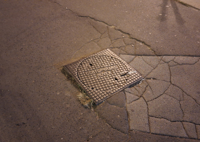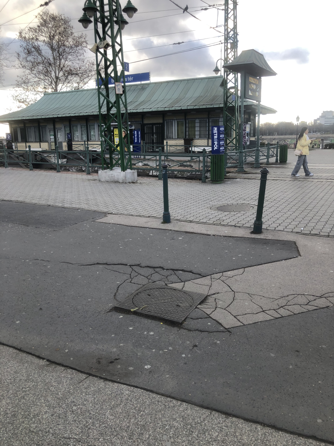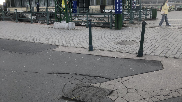A Boráros téri HÉV végállomás melletti forgalmas járdán kiáll a csatorna fedlap, körülötte megsüllyedt a talaj, az aszfalt.