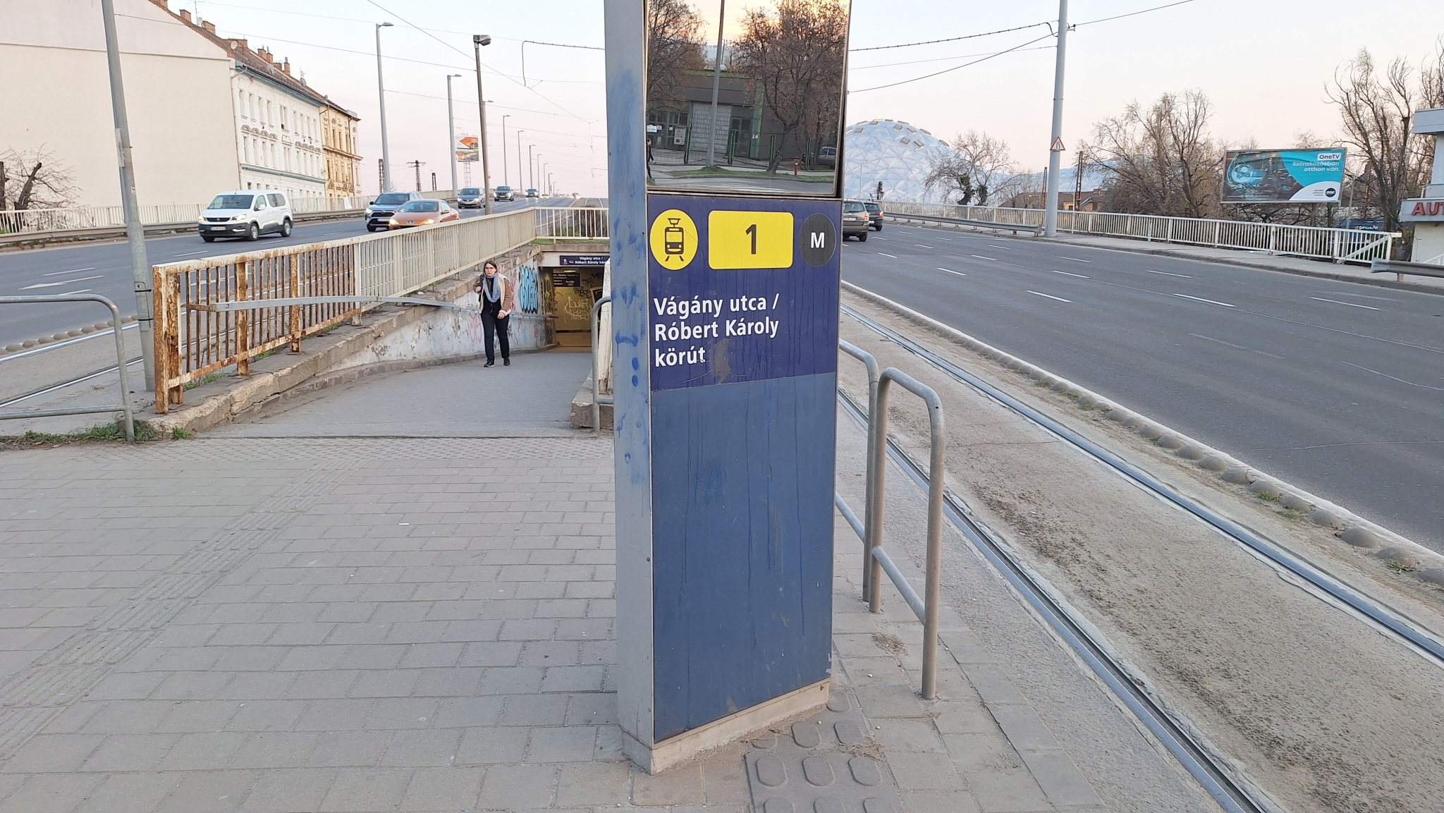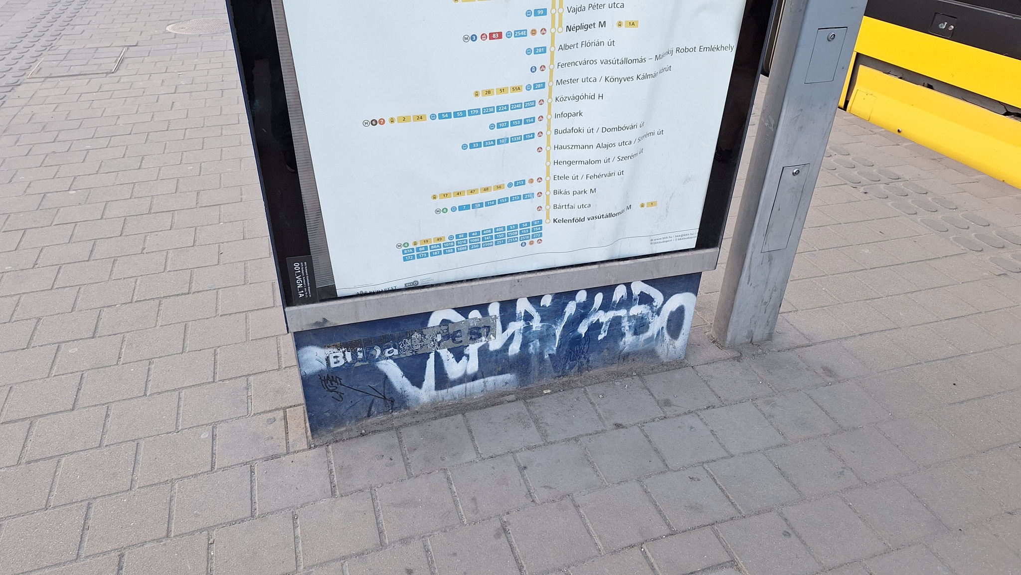 Az 1-es villamos Vágány utca / Róbert Károly körút megállója tele van firkálva.