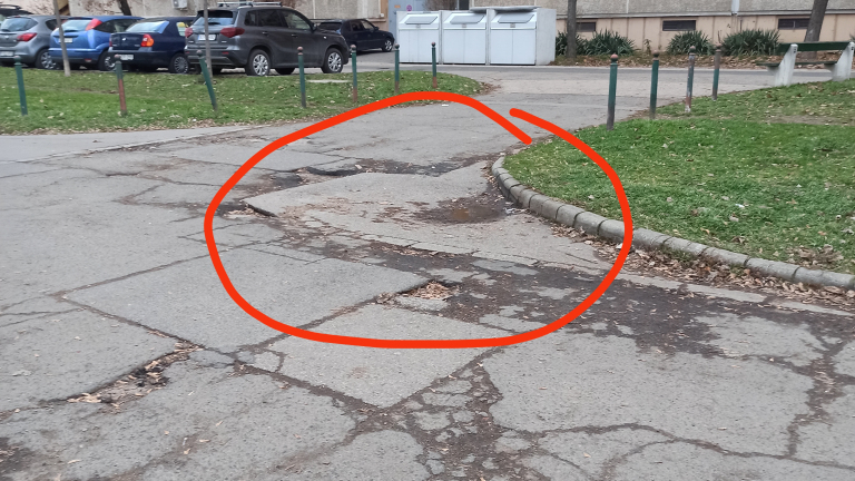 A képen látható helyen megsüppedt az út, ami hamarosan beszakadára kerül. Továbbá eső esetén kerti-tó alakul ki, így a helyieknek Jetskizésre is alkalmas. Kérem a problémát elhárítani. Köszönöm!