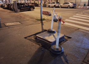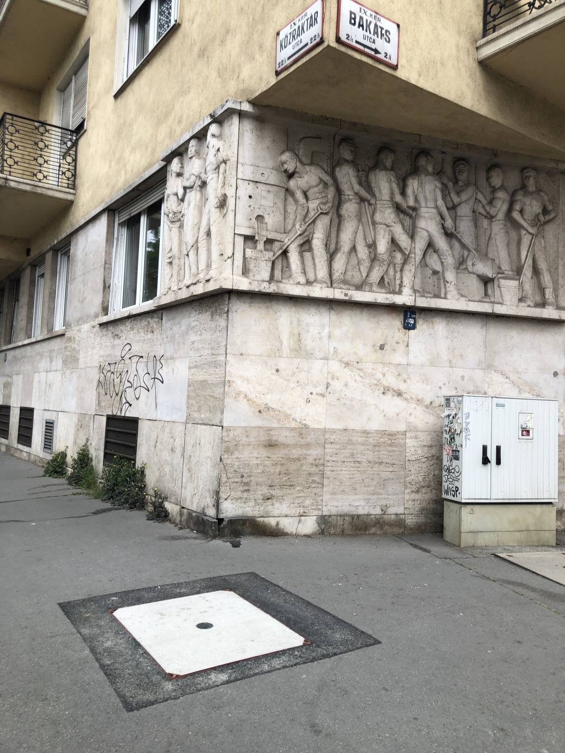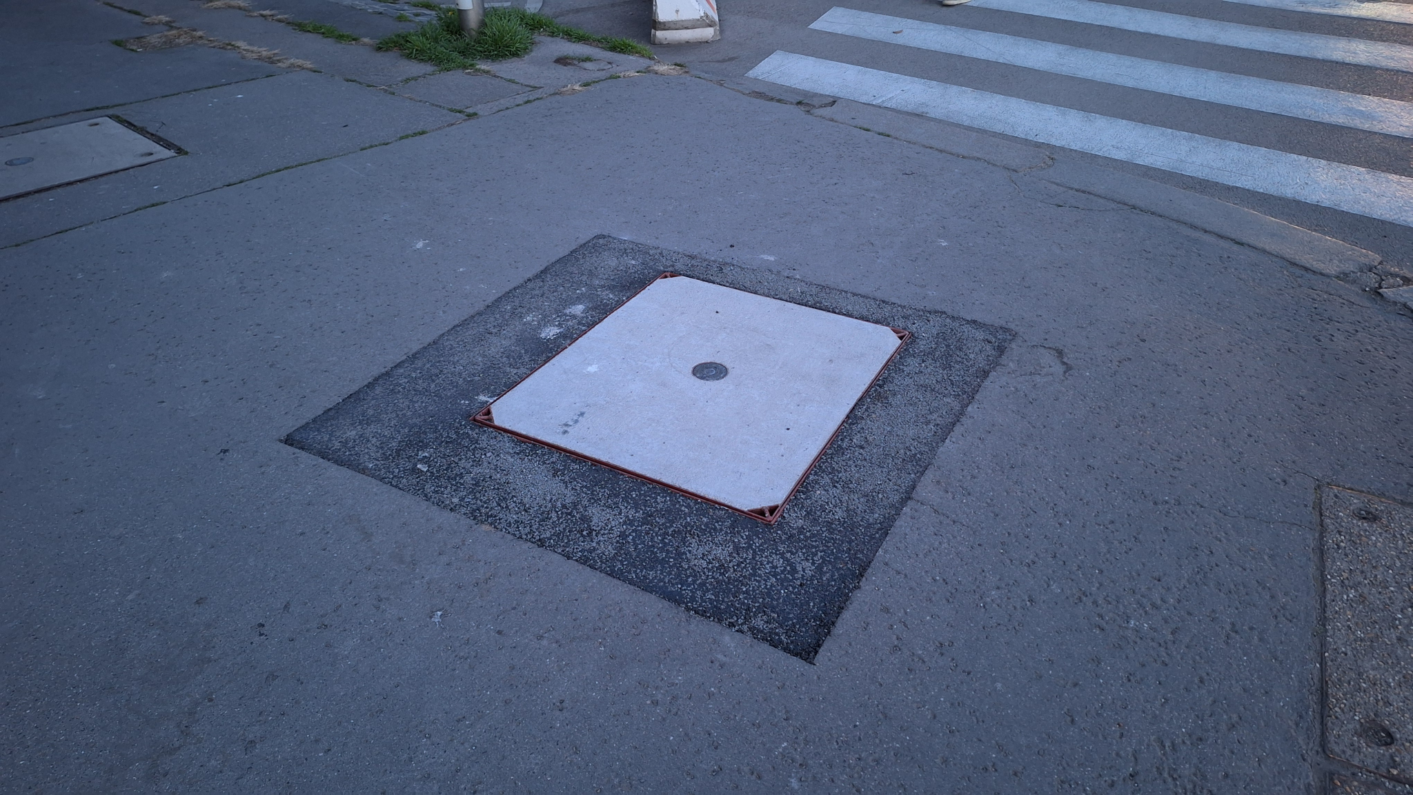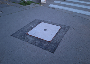 A Közraktár és Bakáts utca sarkán lévő Matáv aknafedél erősen porladt állapotban van.