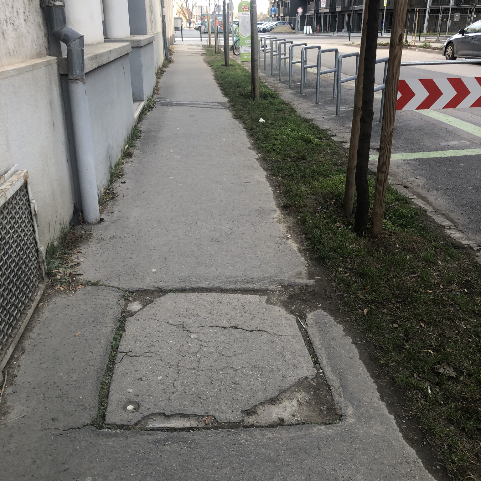 A IX. ker. Vaskapu u. 42. környékén egy sérült közműfedlap van.