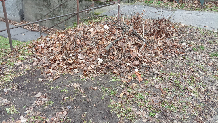 Harmat utca 17D előtt, közel a buszmegállóhoz egy nagy adag avar van kihelyezve, tetején letört faágakkal.