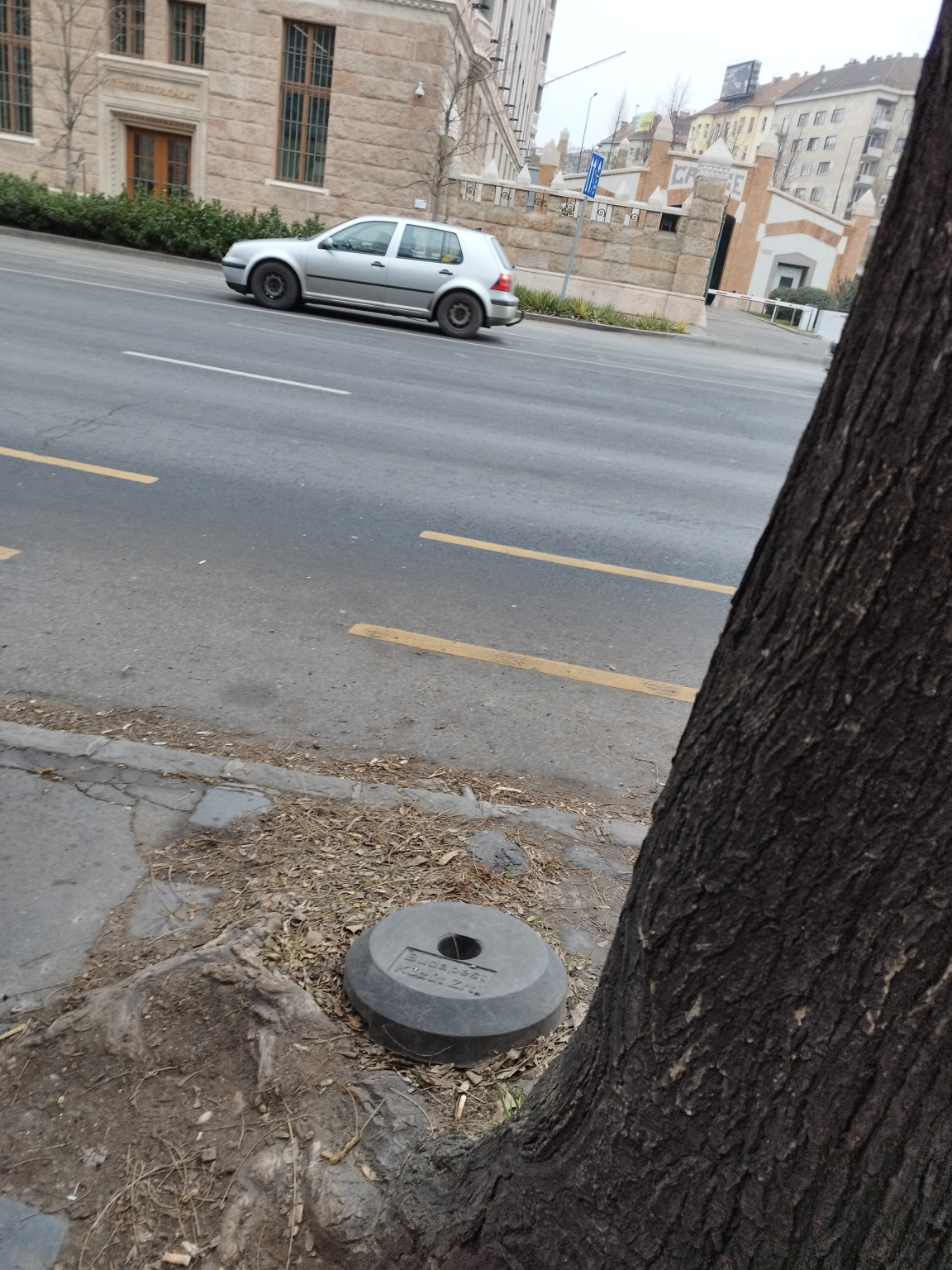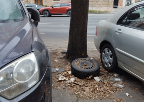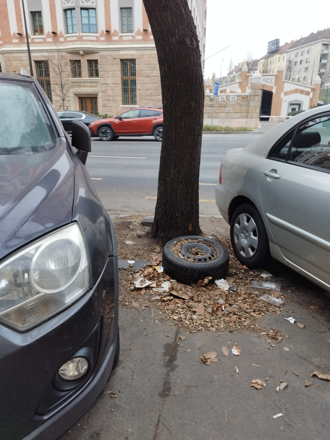 A Krisztina krt. 11-nél a fánál hever egy kerék és egy Bp. Közútas oszloptalp.