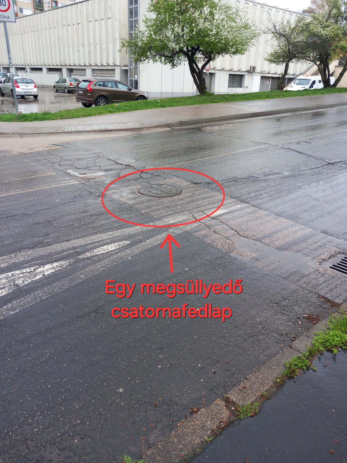 A Harmat utcai útvonalon Kővágó utcai bejárata mellett elhaladással az Újhegyi sétány csomópont felé 85 ös, 85E, 68 as, 268 as, 117 es és 185 ös autóbusz vonalán a jobboldali csatornafedlap lassan megsüllyed