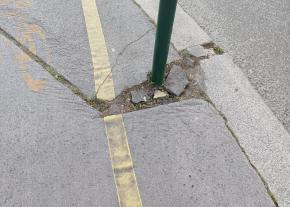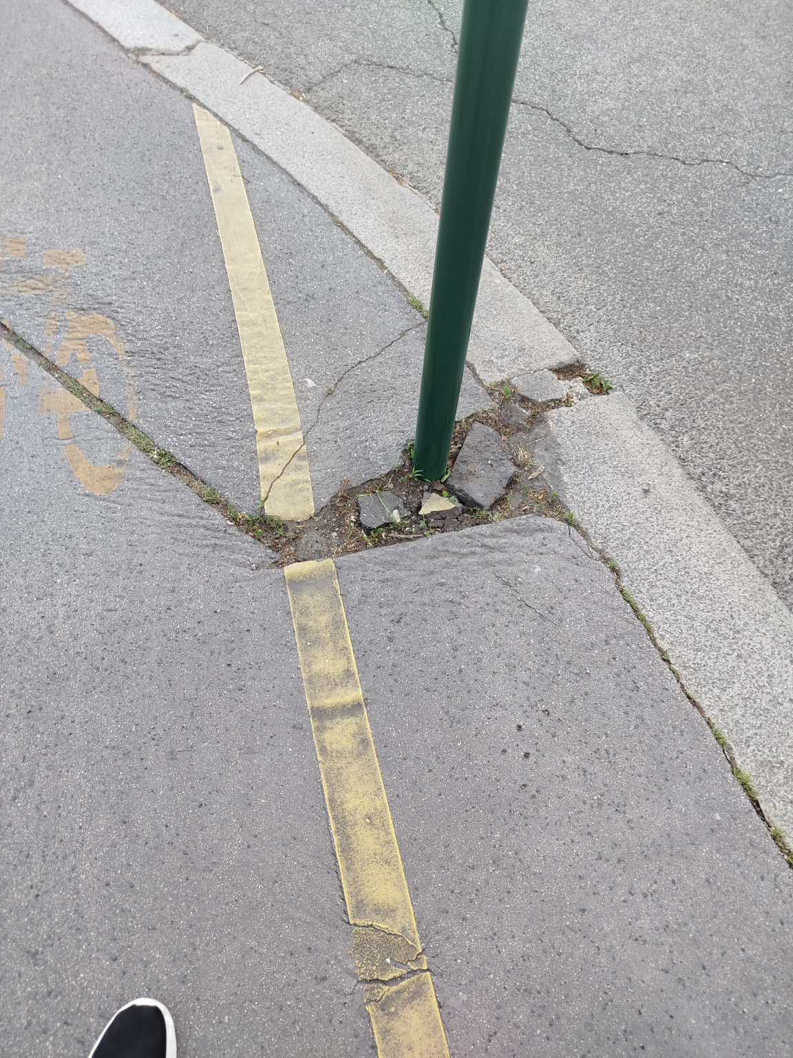 A Jászai Mari tér észak-nyugati végében, a kerékpárút burkolata feljött, és veszélyesen kiáll.