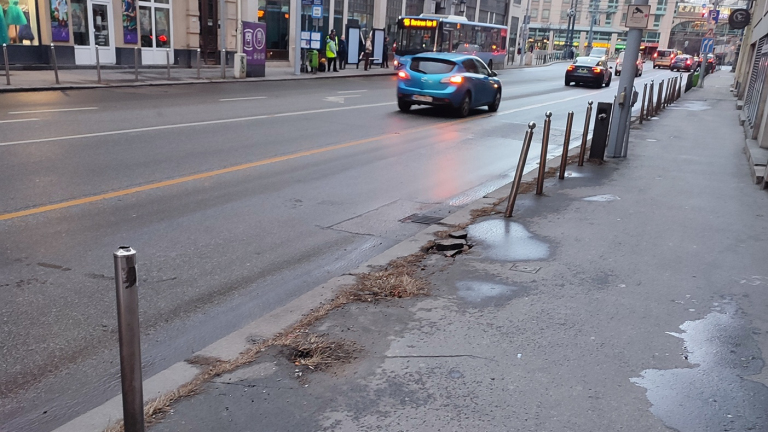Az Üllői út 2-4. előtt még valamikor novemberben egy autó letarolt három pollert, néhol megbontva ezzel az aszfaltot is. A romokat még tavaly eltakarították, de a pótlás-helyreállítás egyelőre nem történt meg.