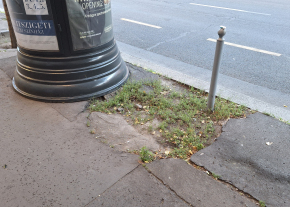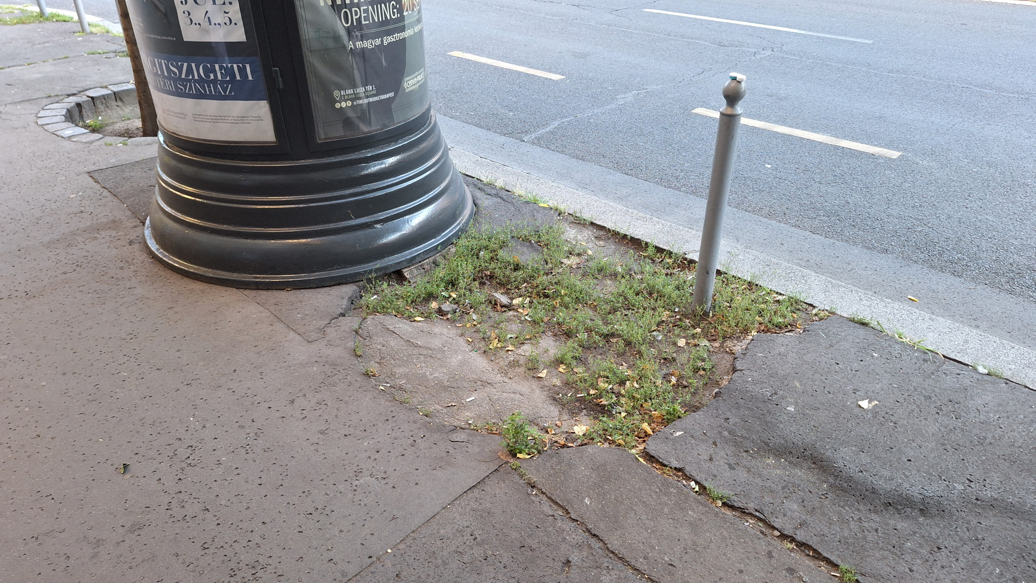 A Teréz körút 47. előtti hirdetőoszlop mellett kör alakban hiányzik az aszfaltburkolat.