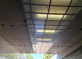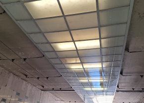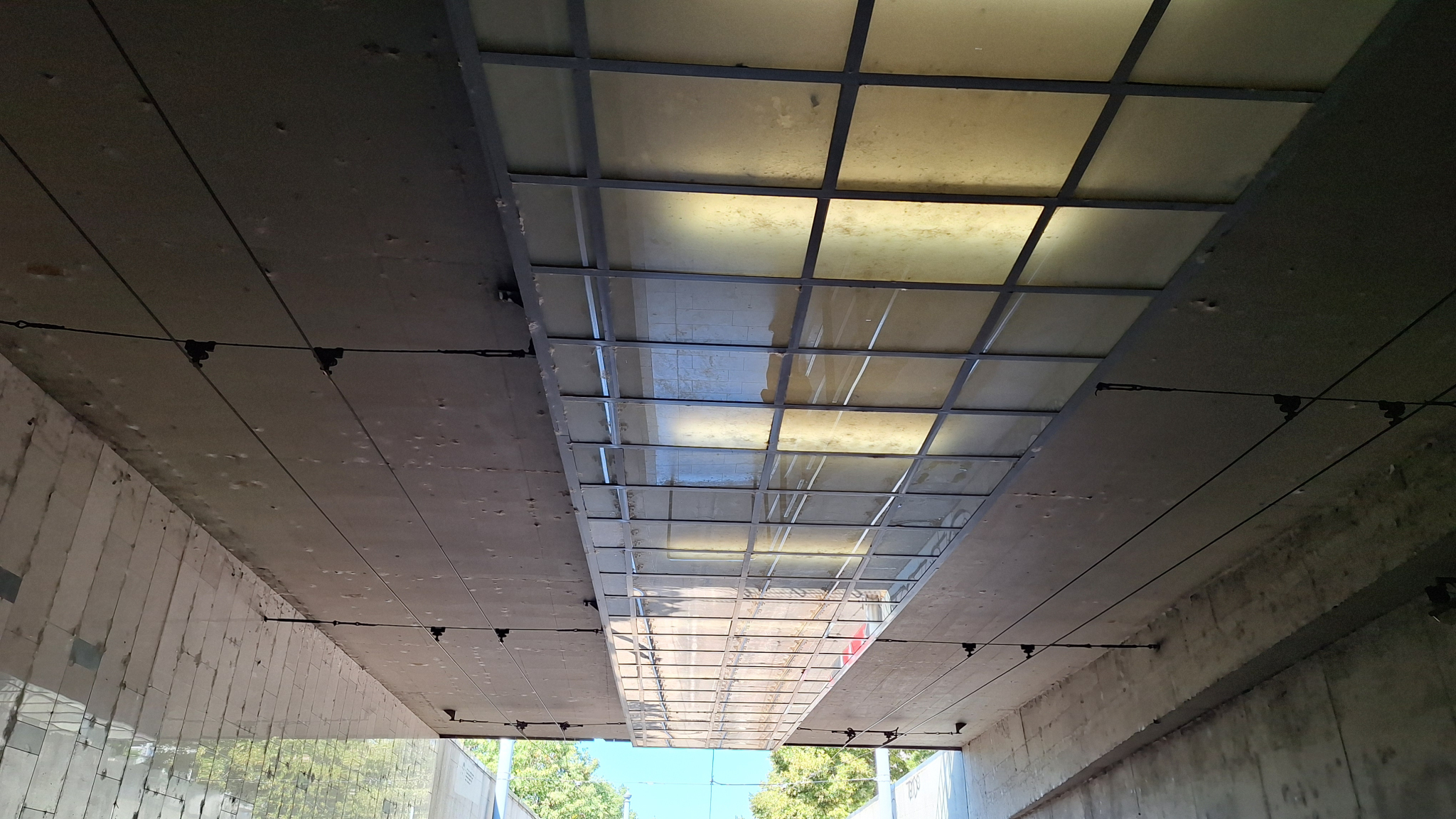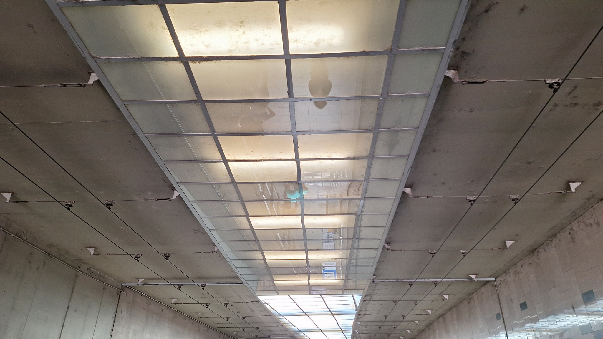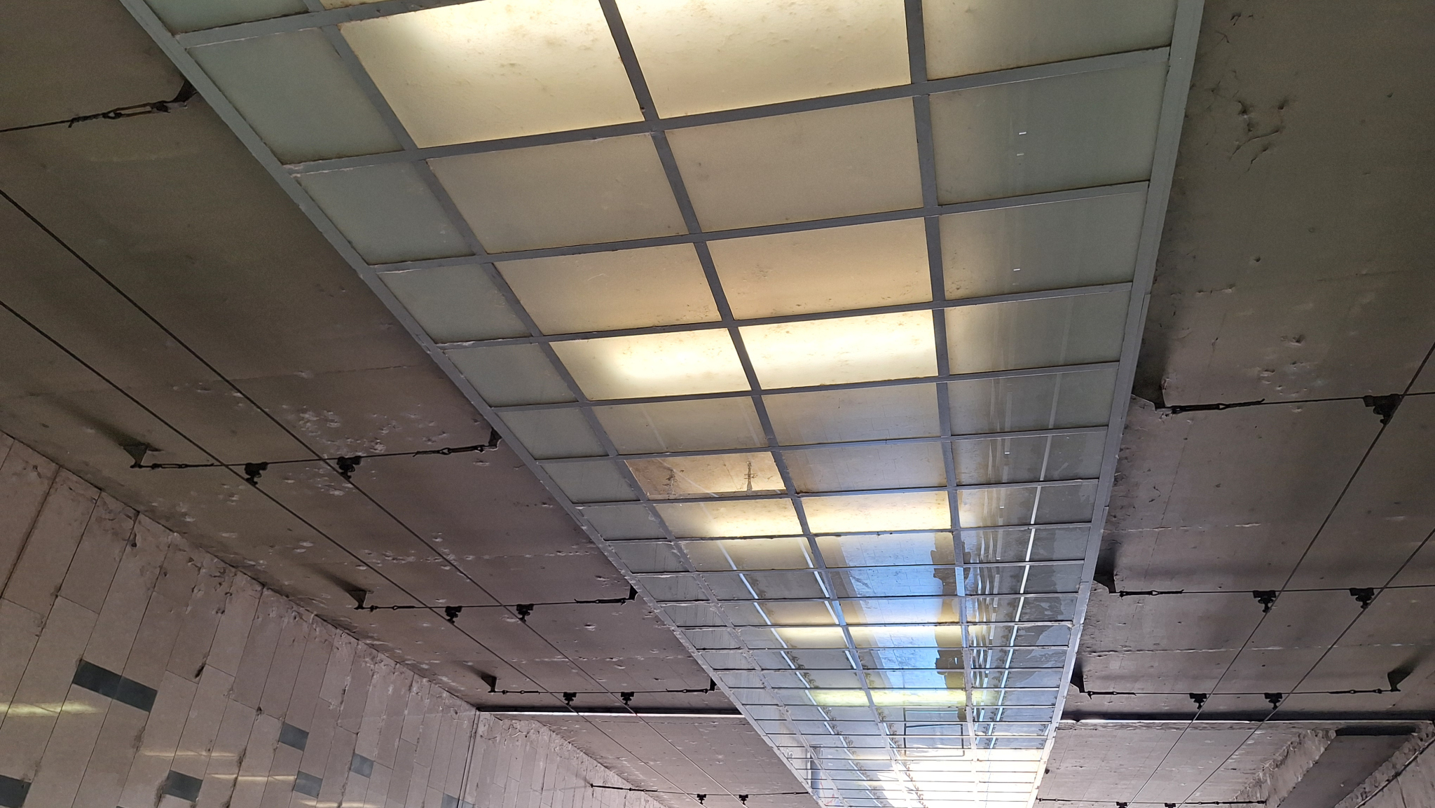 A 2-es villamos Fővám téri peronja fölött világító álmennyezet hiányos, több lapja hiányzik.