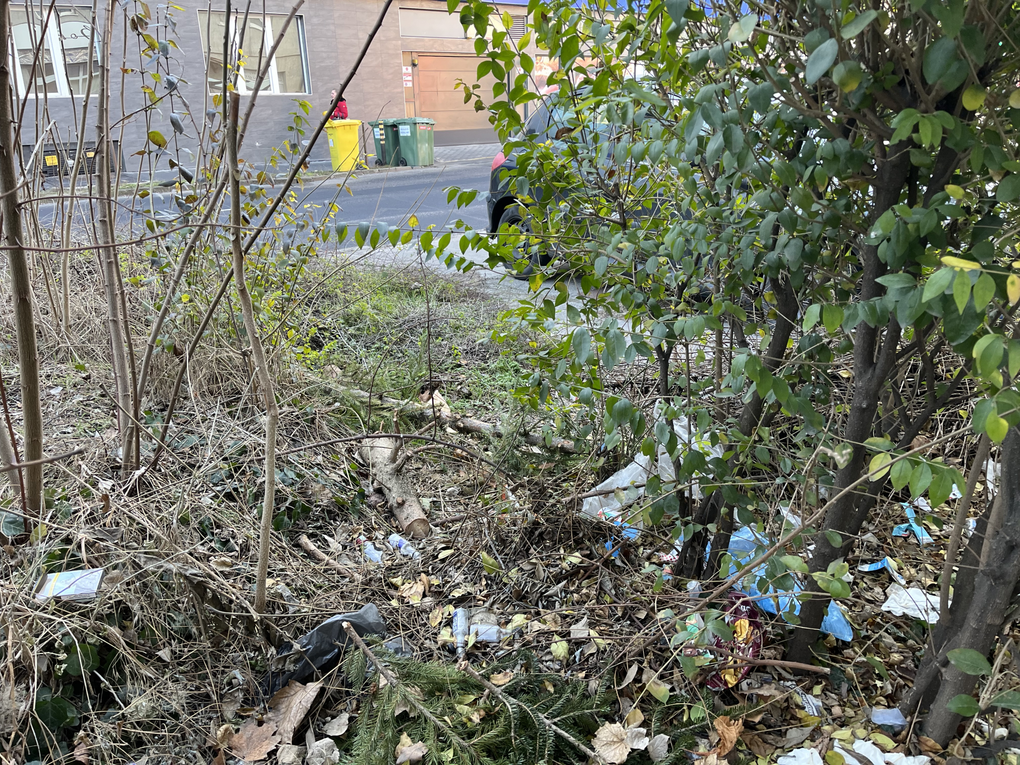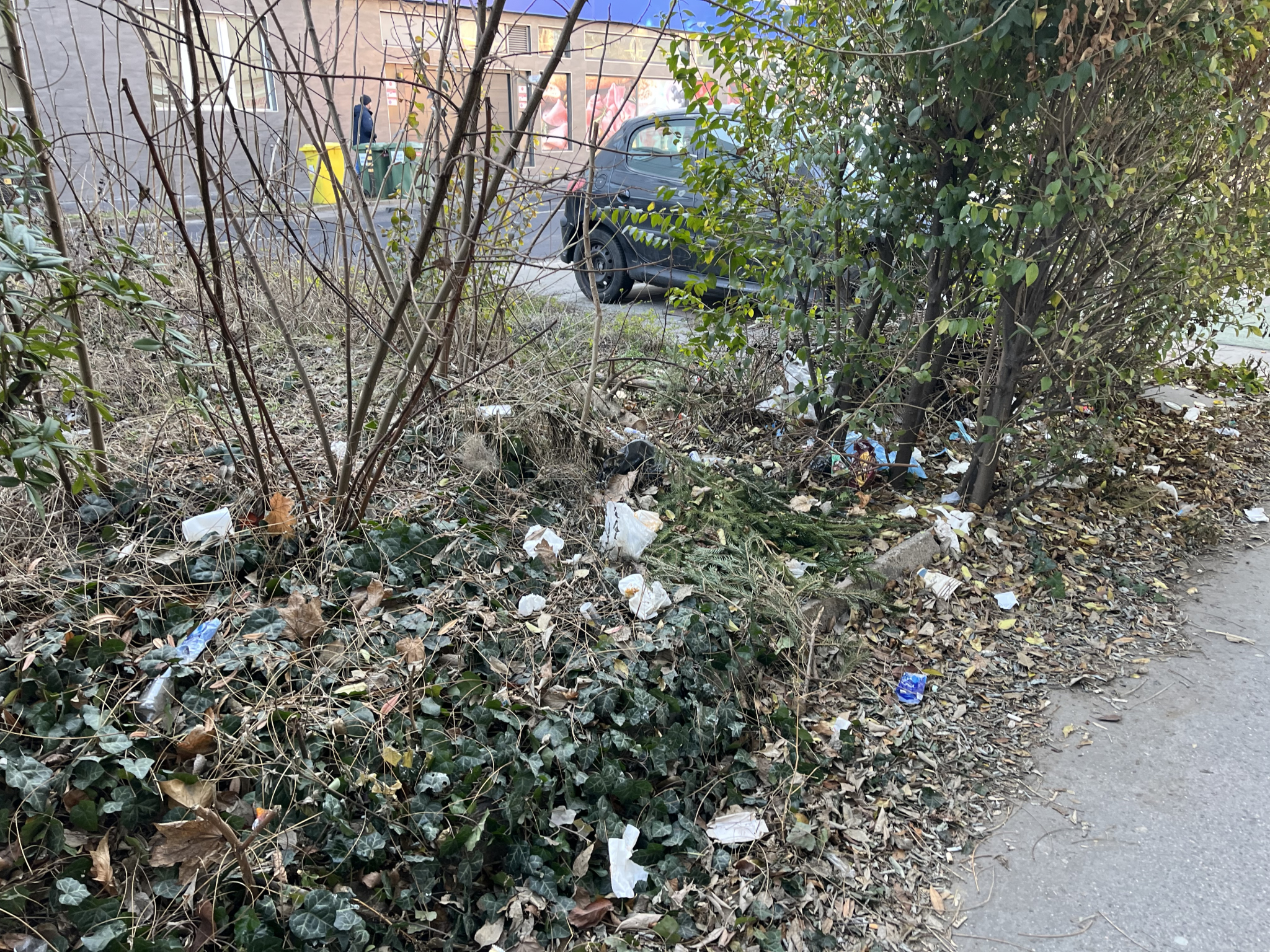 Az ingatlan üzlethelyisége (régen Kifőzde volt, most “Adományház”) előtt - ami valószínűleg önkormányzati tulajdonban van, a bérbeadási táblából következtetve - elburjánzott a növényzet, tele van invazív gyomfával (Alianthus sp.), sarjhajtásokkal, hajléktalanok ott végzik a kisebb-nagyobb dolgukat és ezek a járdán való közlekedést is nehezítik, közbiztonsági okokból fokozottan veszélyesek, főleg az esti közlekedésnél.