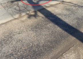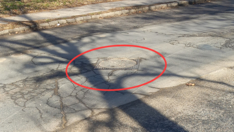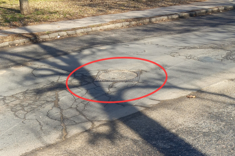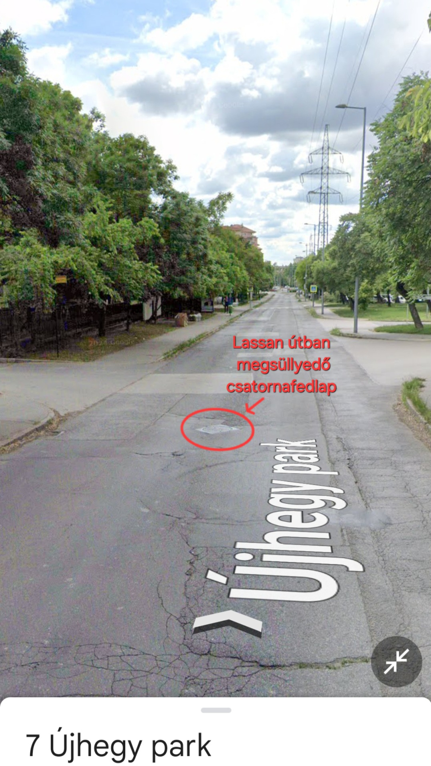 A Tavas utcai útvonalon Tovirág utcai bejárata mellett, 85 ös, 85E és 117 es autóbusz vonalán a csatornafedlap lassan nagyon útban süllyedés látható