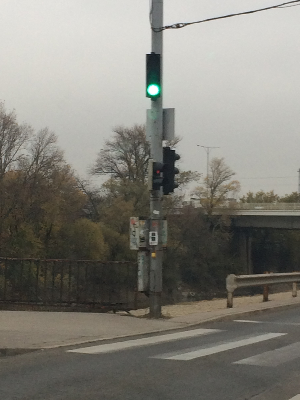 Jelzett helyszínen, a közlekedési lámpára szerelt elektromos doboz / szekrény állapota borzasztó. Rozsdás, firkás, rongált, graffitis - nagyon rég óta!