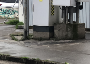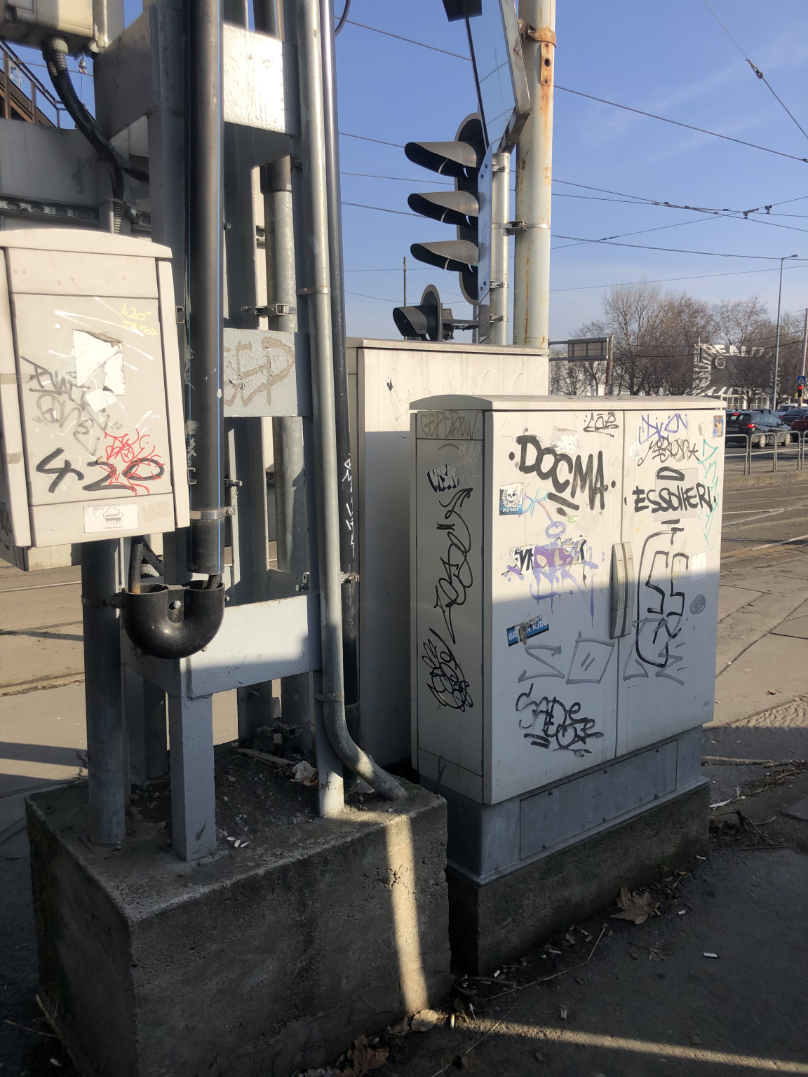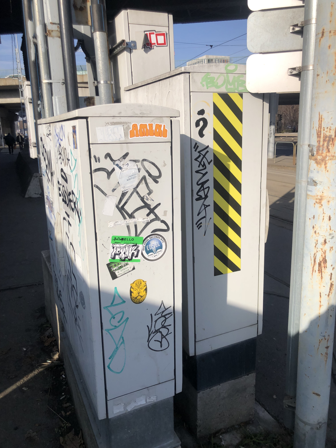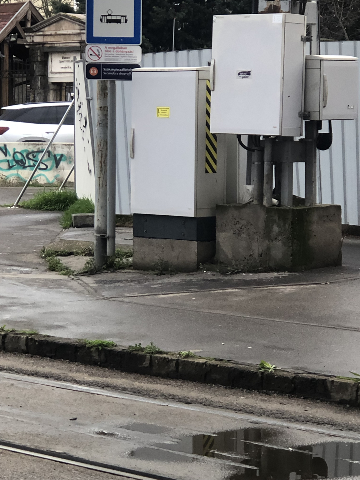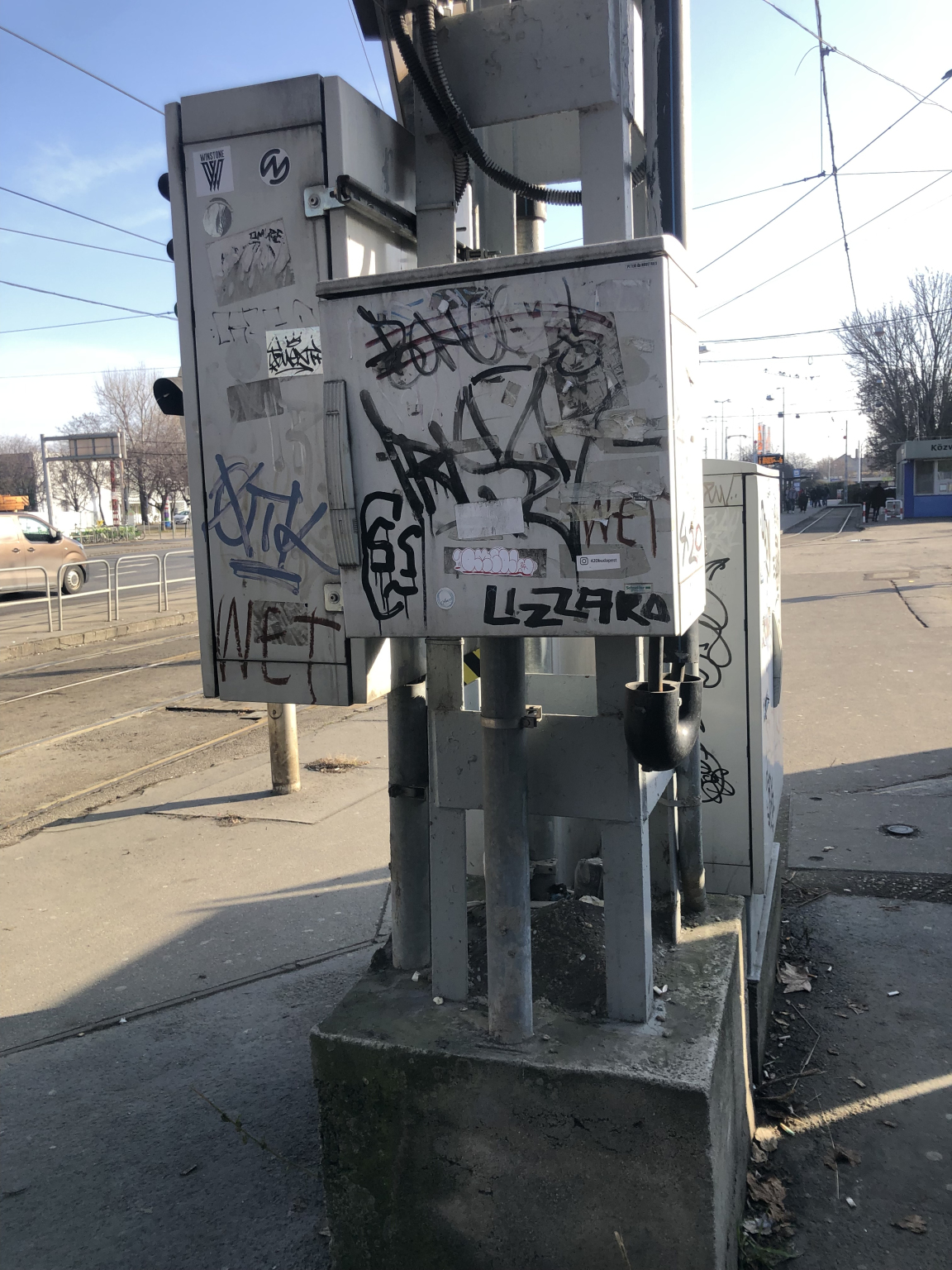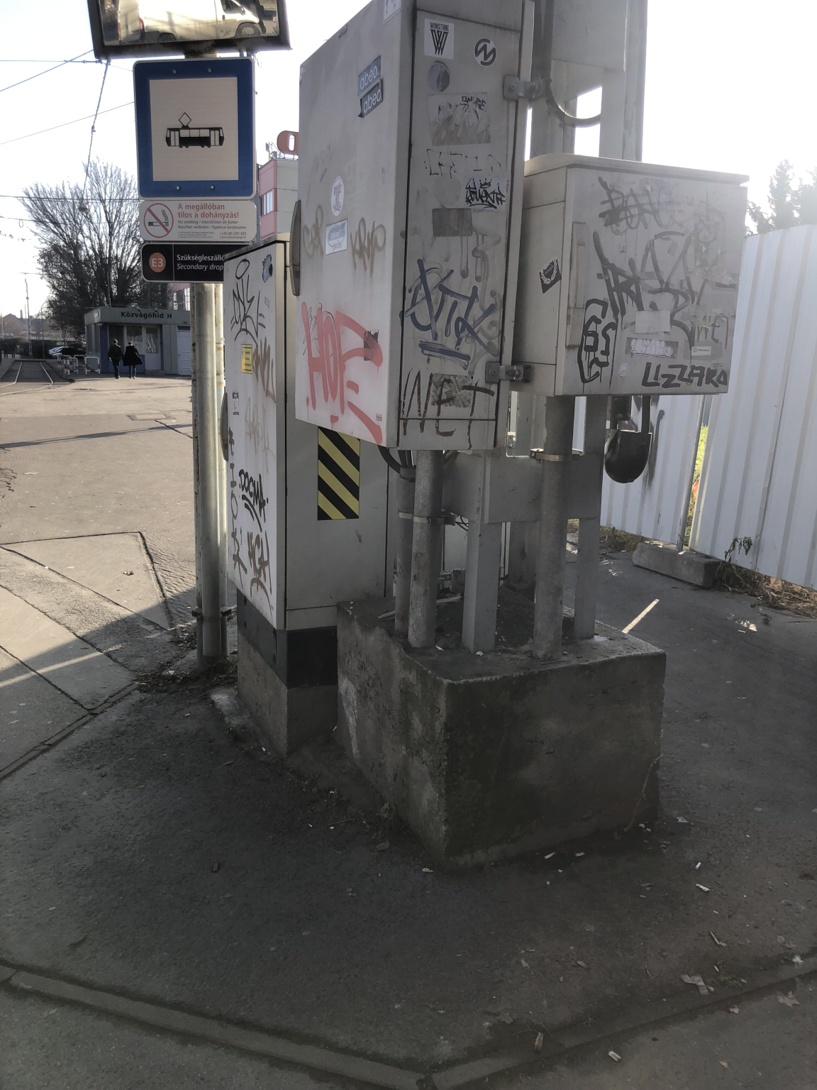 A Közvágóhídon a villamosvégállomás felé feltehetően egy BKK-s közműszekrényhalom tele van graffitivel.