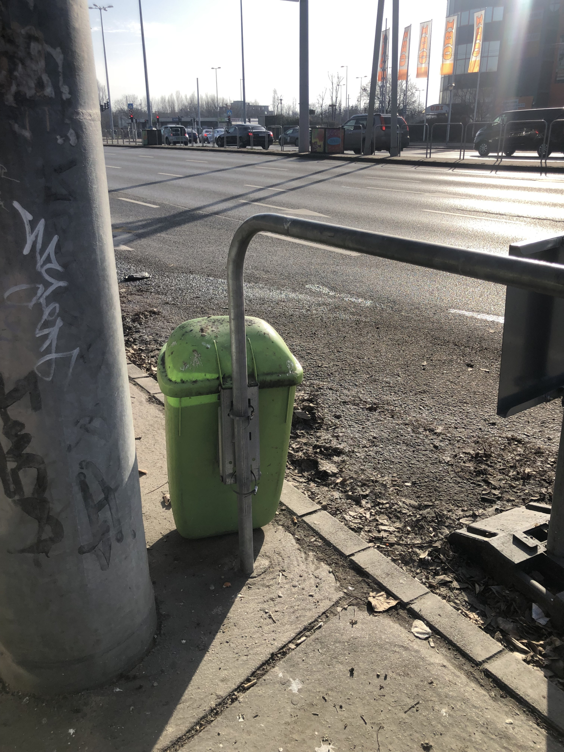 A Közvágóhídnál a Budapest Park előtti buszmegállóban egy kuka lecsúszott.