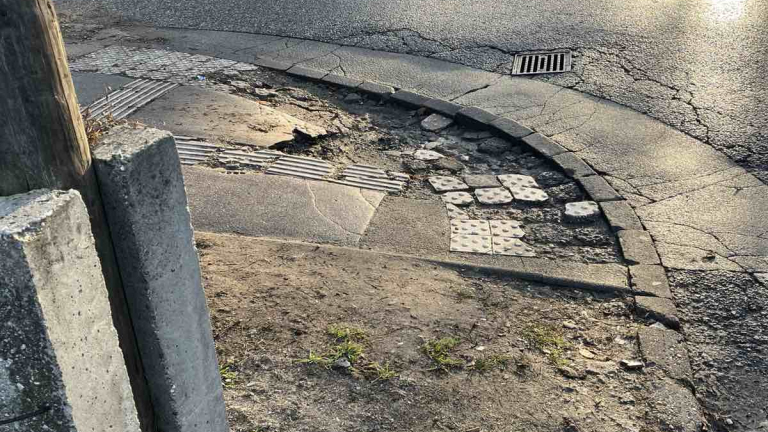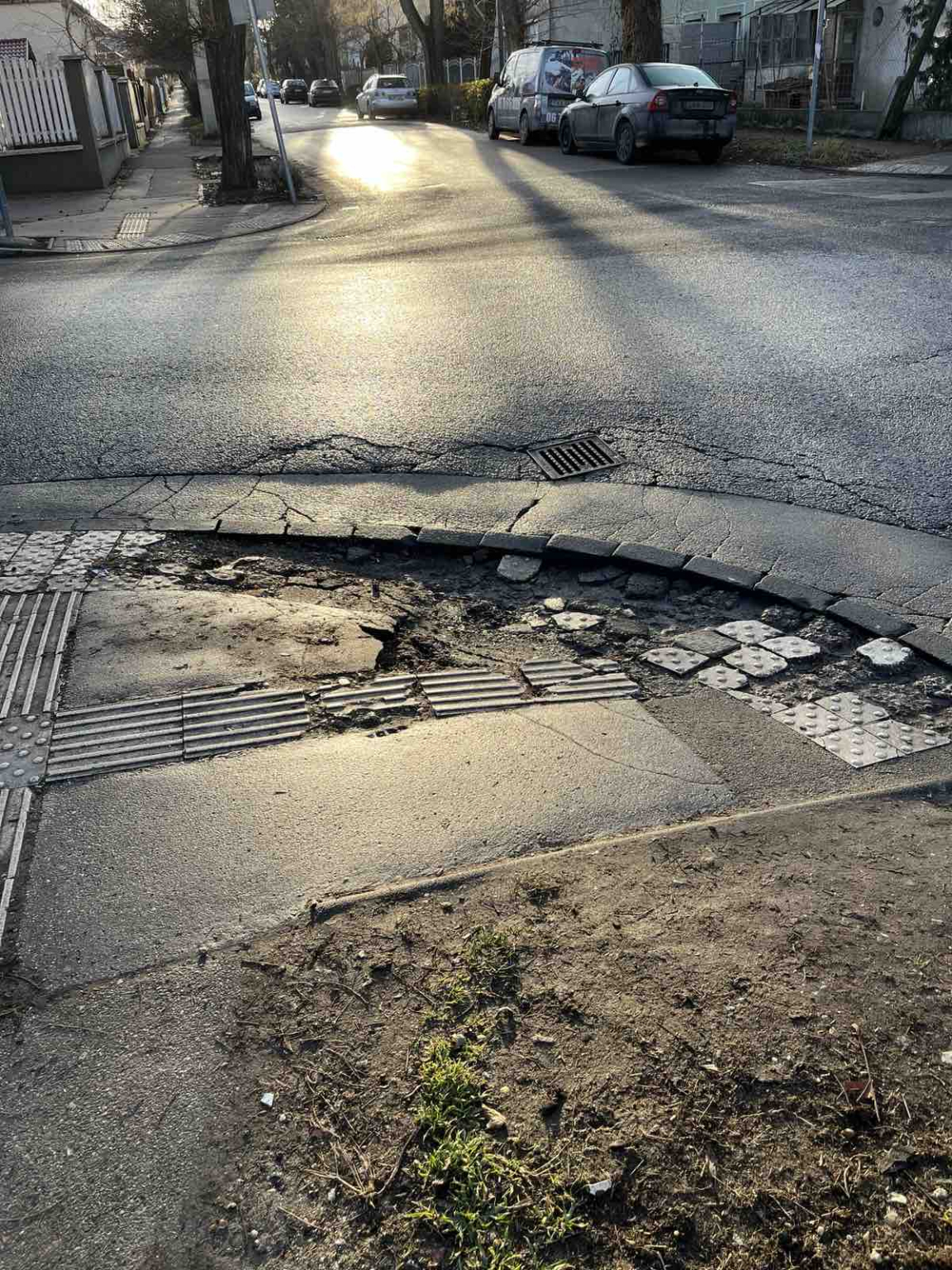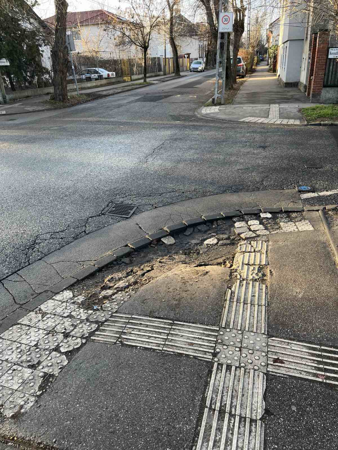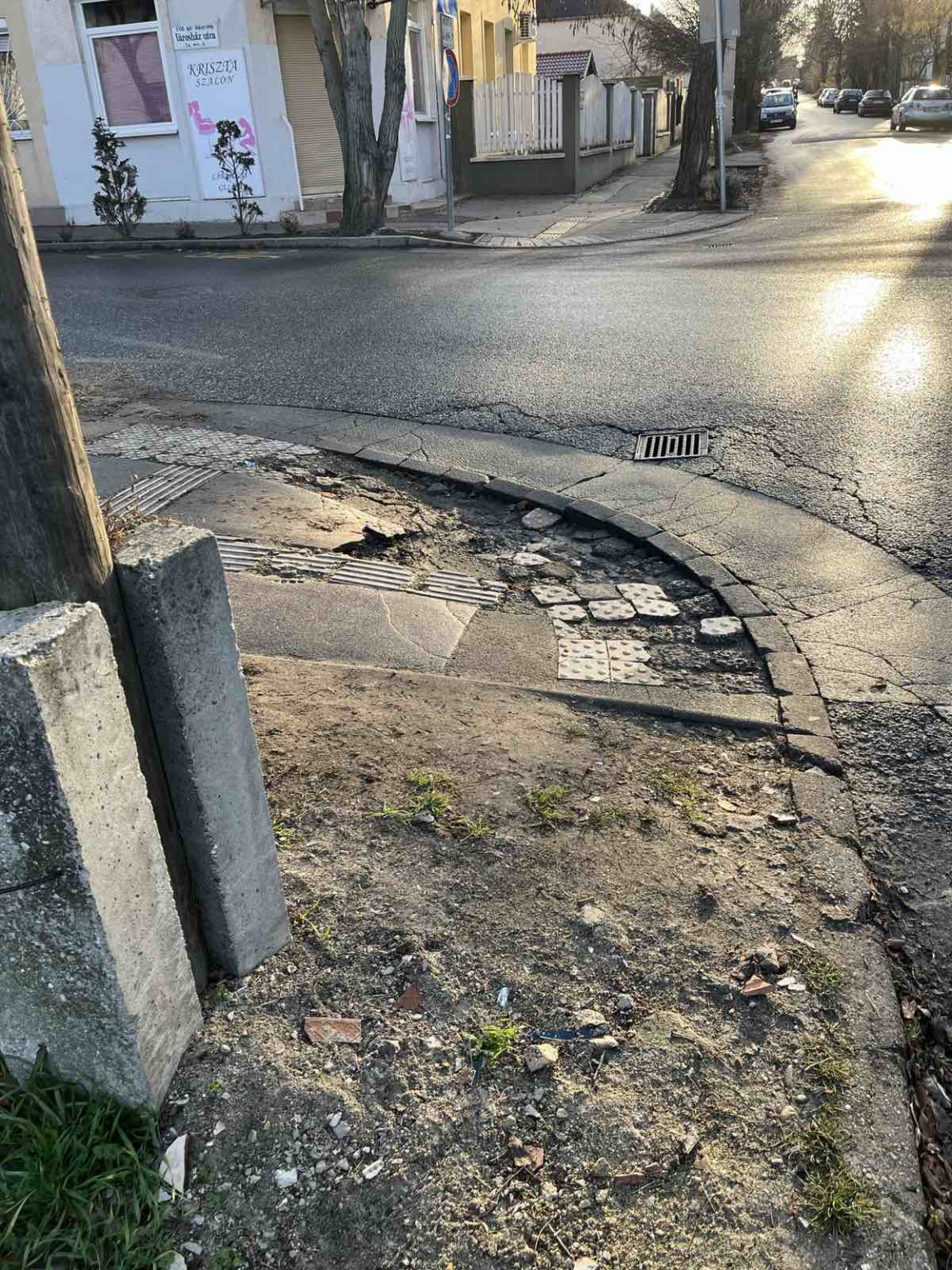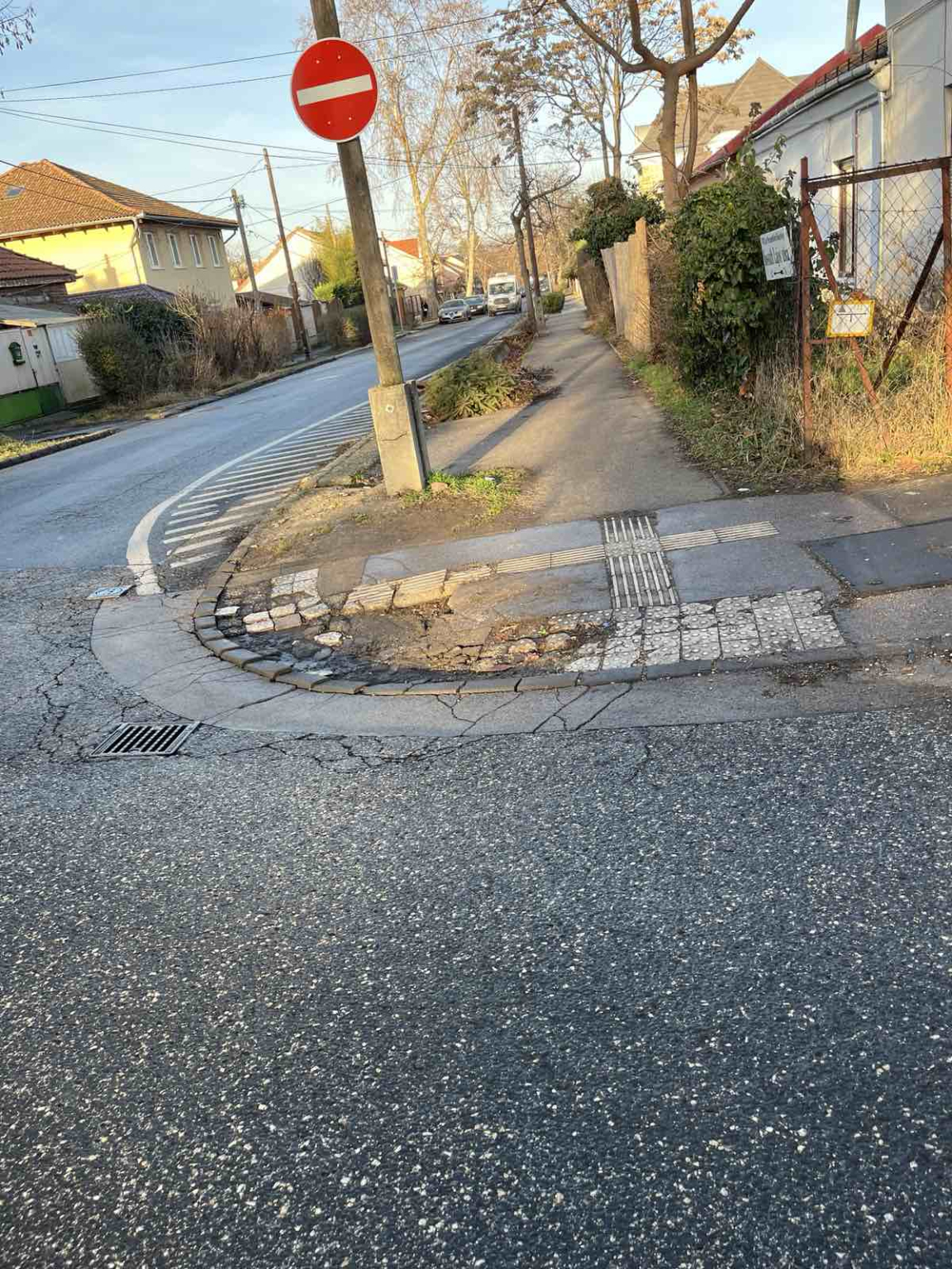 A XVIII. kerület Kossuth Lajos utca - Városház utca sarkán az egyik oldalon teljesen össze van törve az akadálymentesített járdaszegély. Ezen a sarkon csuklós busz kanyarodik, nagy valószínűséggel ez okozza a problémát. Amikor megjavítják, nem hiszem, hogy érdemes ugyanígy megcsinálni, valahogy hozzá kéne igazítani az autóbusz kanyarodásához a sarkot.