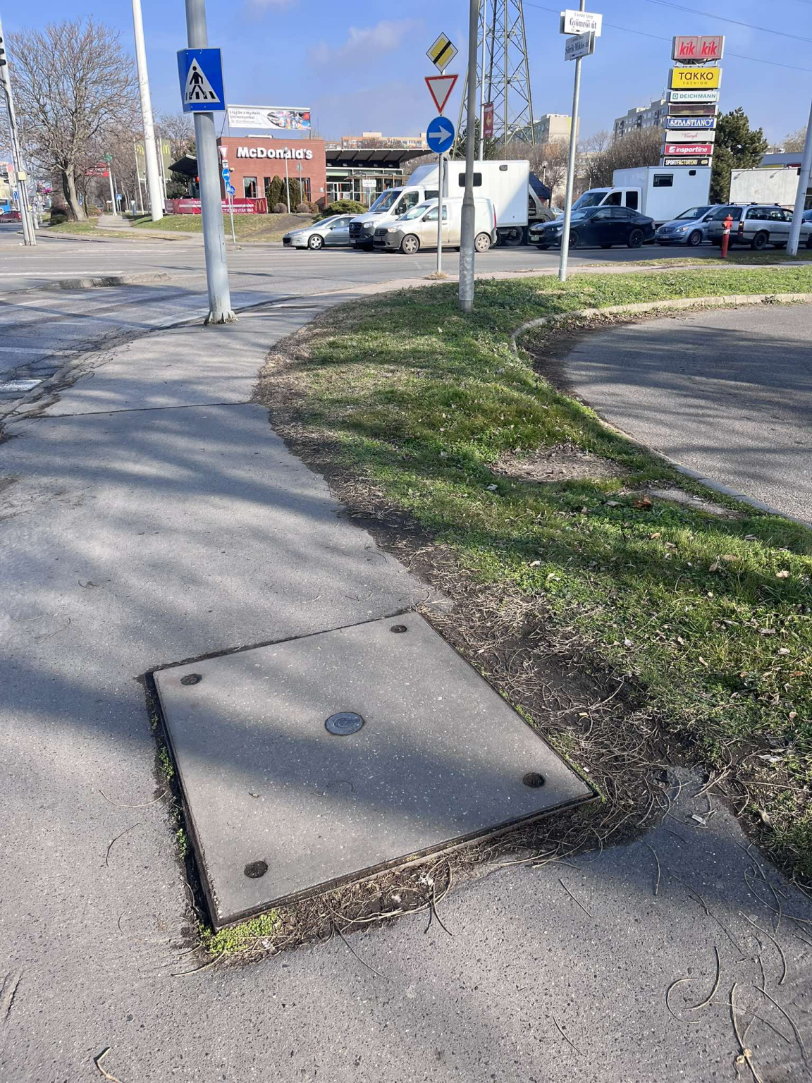 Telekomos fedlap kiáll a járdából.