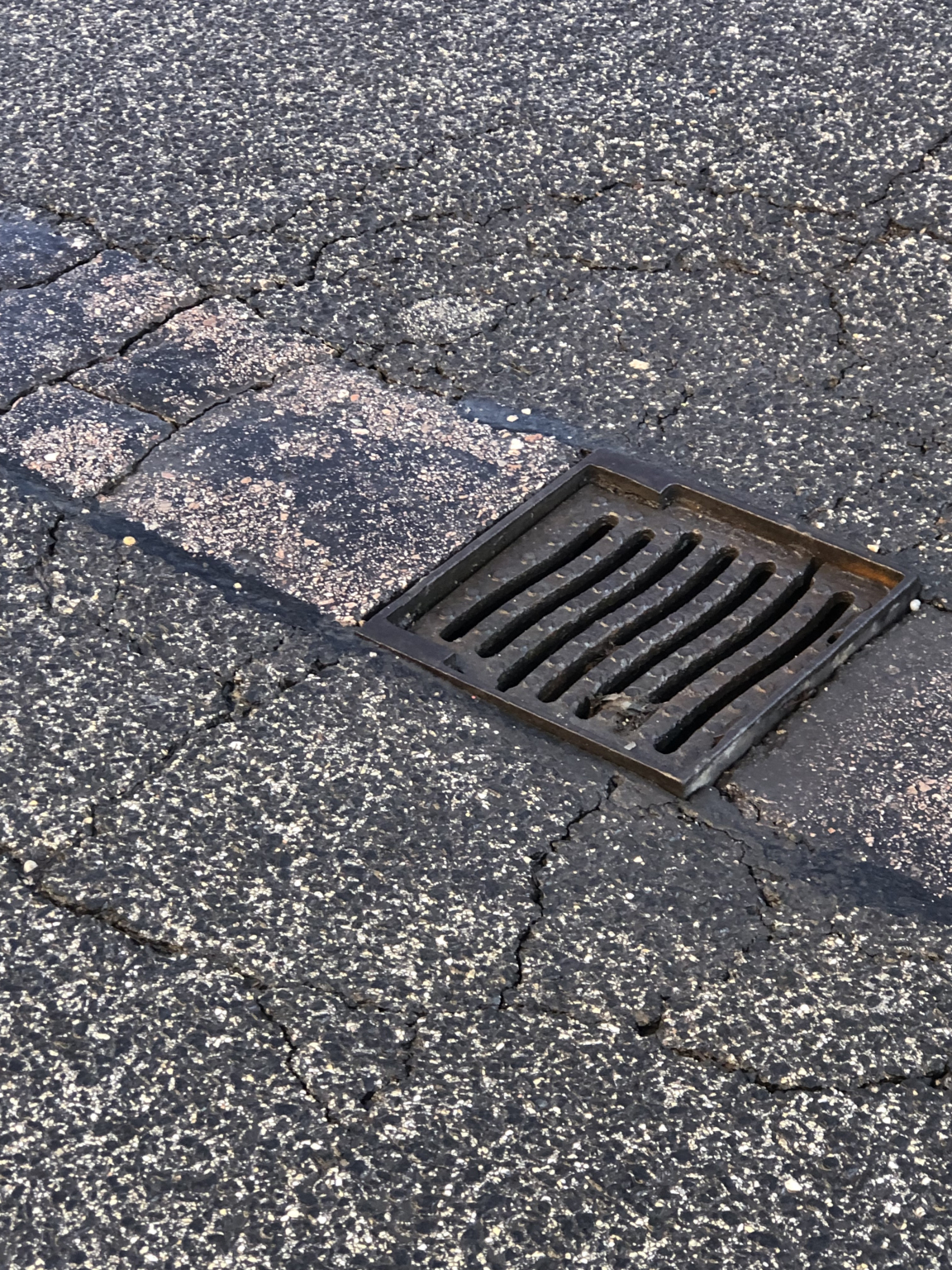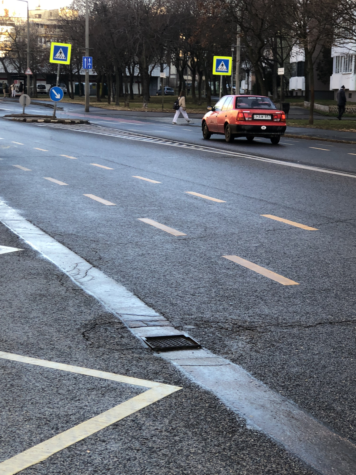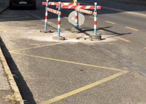 A xx. kerület Baross u. 38. előtt élesen kiáll a víznyelő rács pereme, és emellett betonmélyedés is van ott.