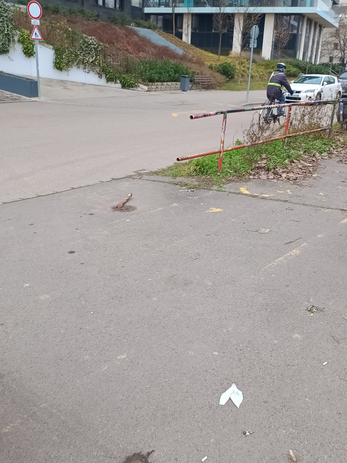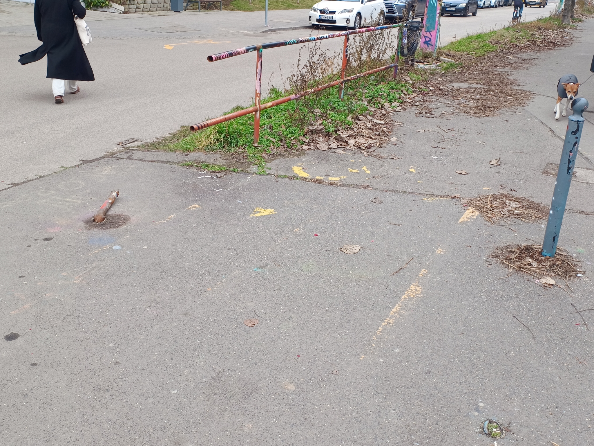 Kidőlt a korlát, a maradványa továbbra is kiáll, balesetveszélyes az egész.