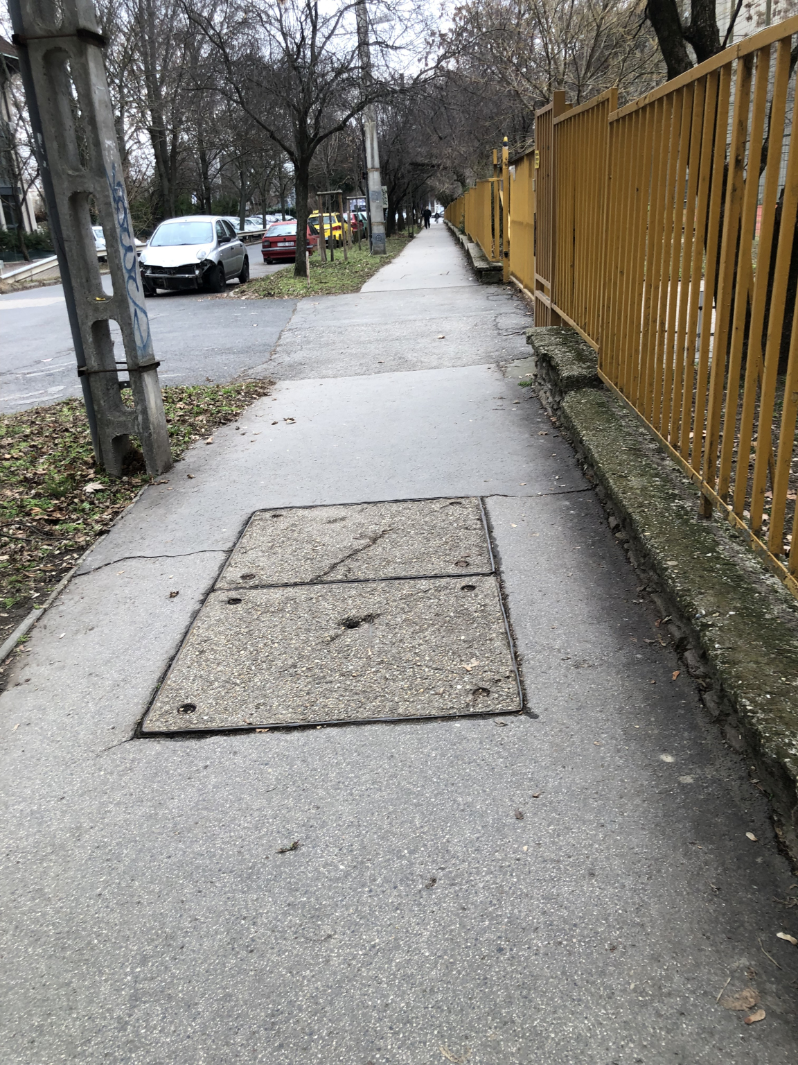 A Dayka Gábor u. 2-4.-nél egy billegő, kopott, törött, lyukas közműfedlap páros van.
