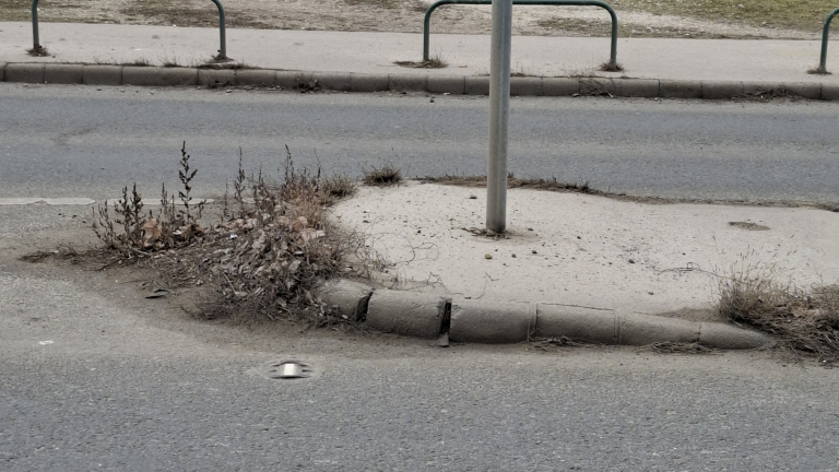Szemetes (sok csikk és apró hulladék), illetve kiszáradt gáz, föld található a gyalogátkelő mindkét oldalán és közte a gyalogátkelő szigeten. Kérem takarítanak össze a területen! Köszönöm