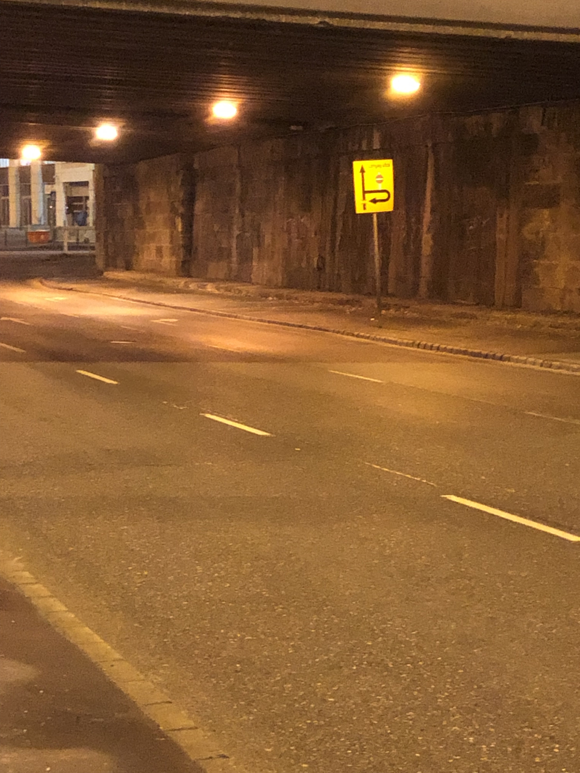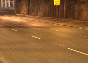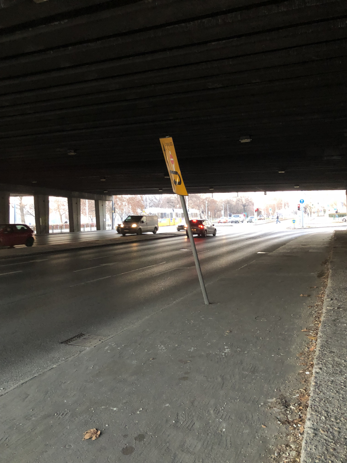 A Soroksári úton a Petőfi híd alatt egy tábla ferde, kidőlni készül.