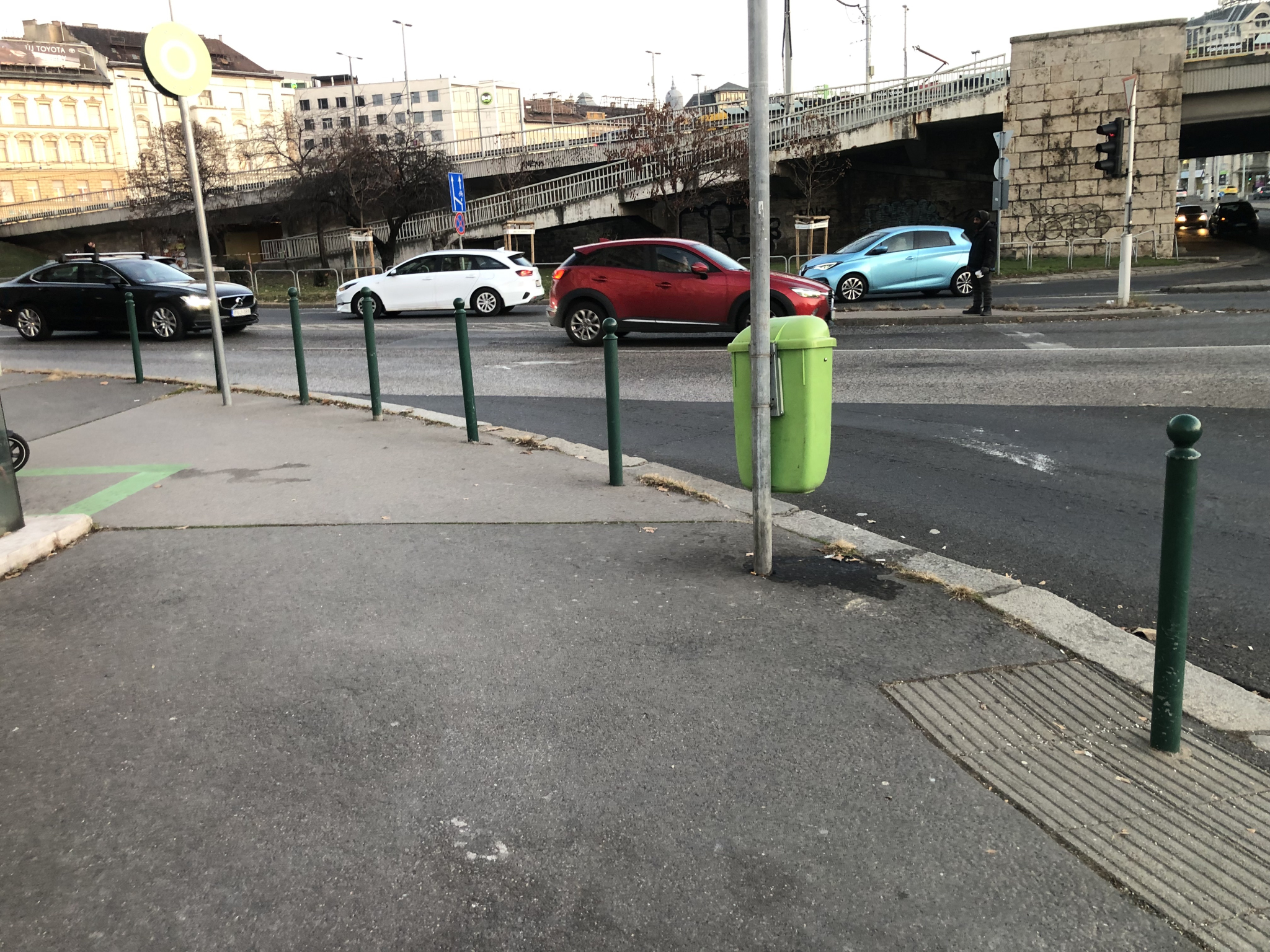 A Közraktár u. Boráros tér felöli végén egy kuka az úttest felé fordult.