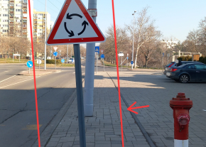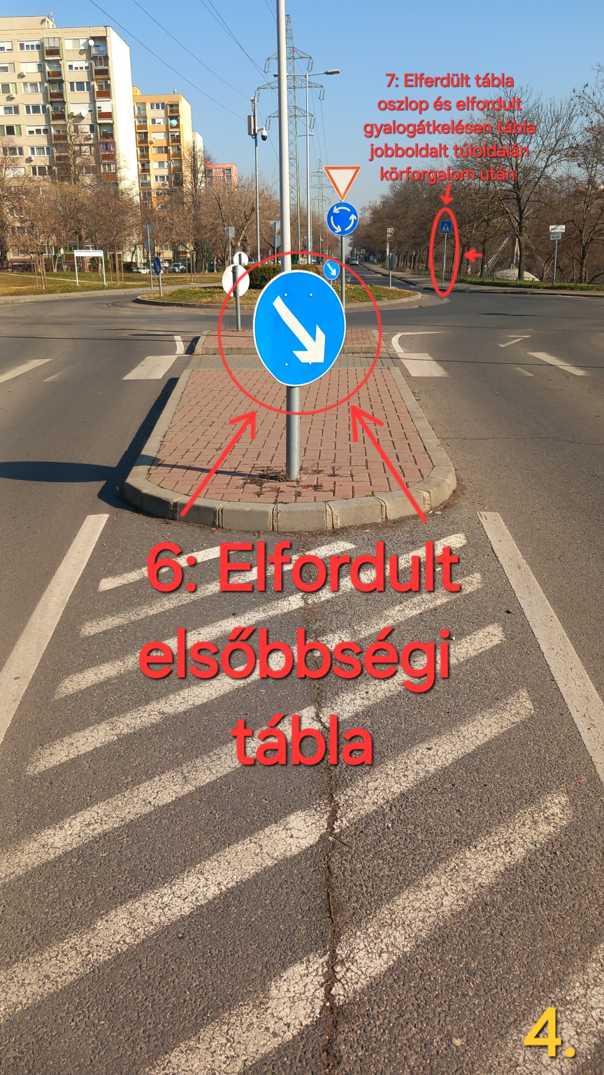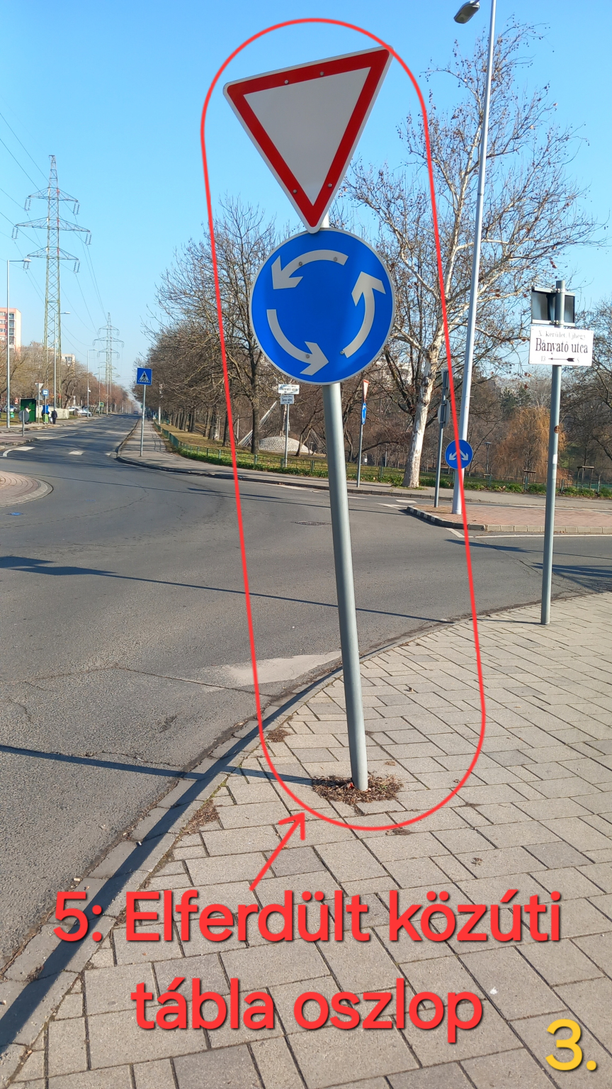 A Tavas utca és Bányató utca találkozás tól egészen körforgalom között 85 ös, 85E és 117 es busz vonalán, első, második és harmadik oldalon pirossal jelölteken öt darab táblák oszlopok elferdülések vannak ezen a táblák oszlopokon, illetve a negyedik oldalon az elsőbbségi tábla nem irányba van, következő körforgalom után a túloldalán gyalogátkelési tábla nem jó irányba van míg oszlop is elferdülés látható ami körforgalom után túloldalán található
