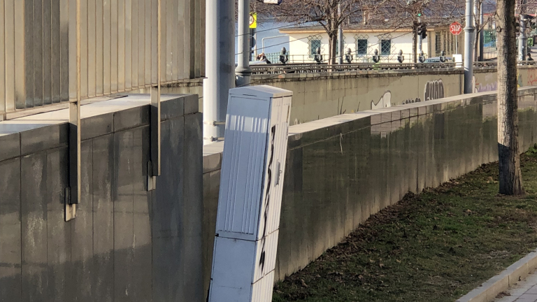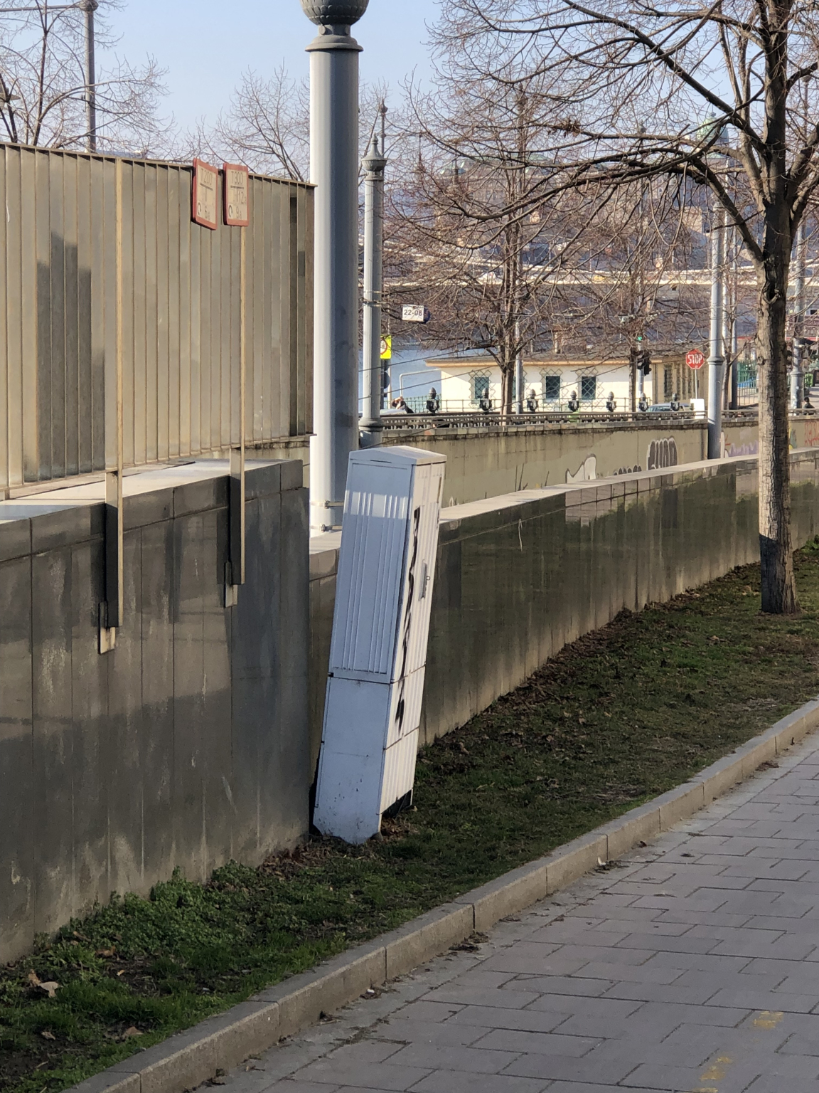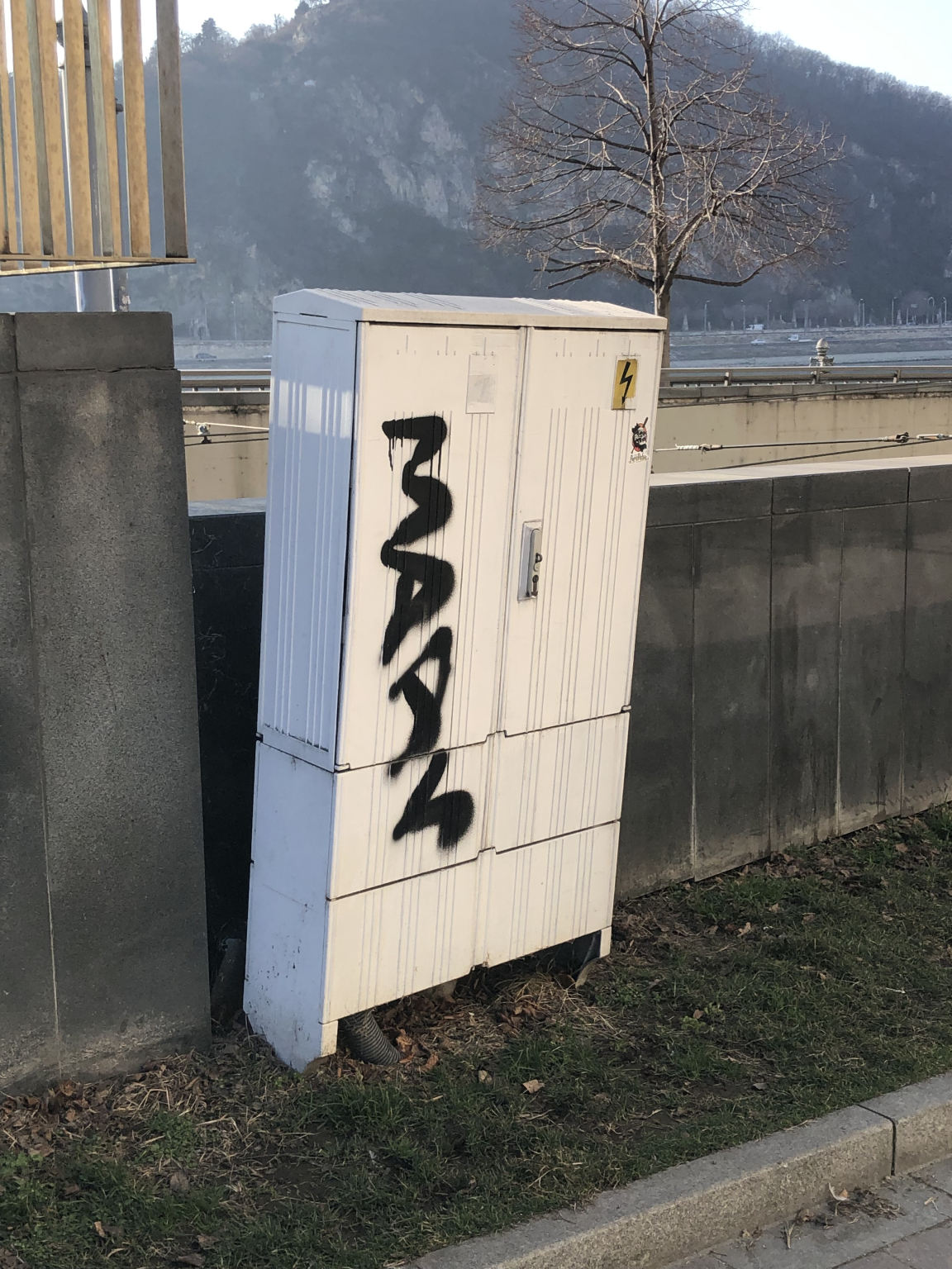 AFővám térnél a 2-es villamosmegállótól nem messze egy ferde közműszekrény van, aminek az alján a fedőlemez is hiányzik, és emellett még graffitis is.