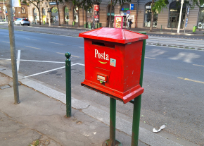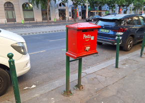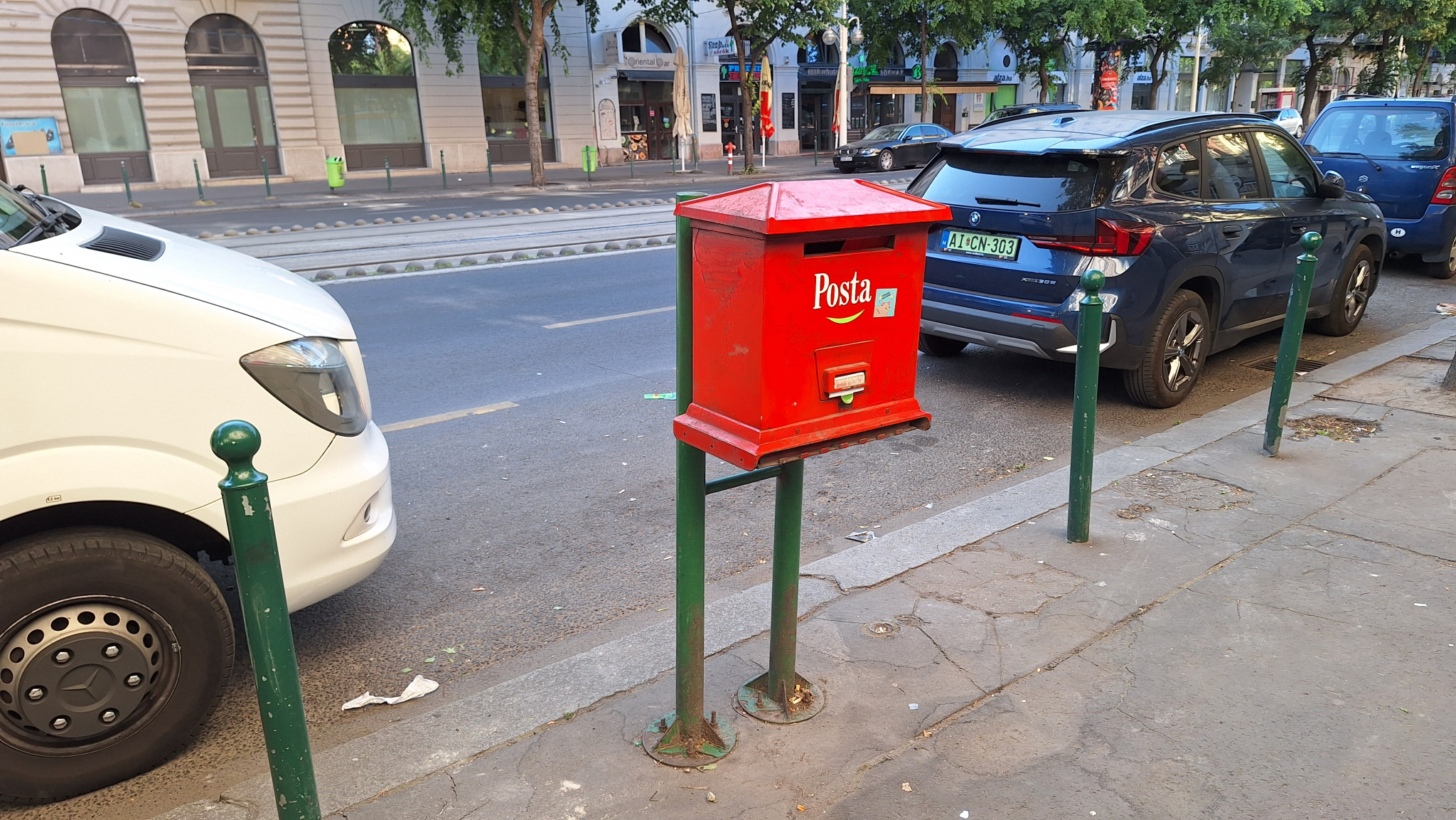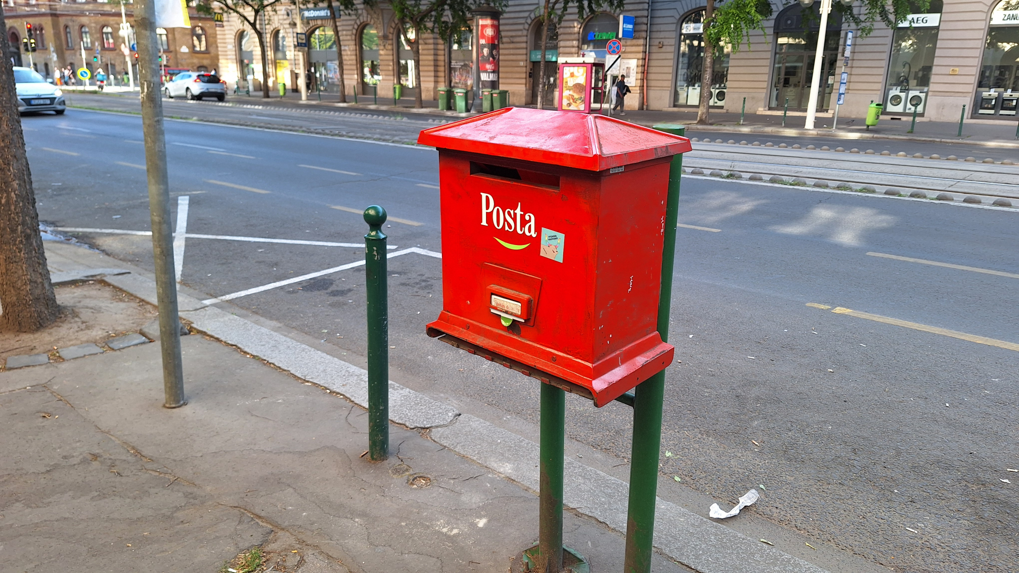A József körút 9. előtti postaláda szét van firkálva, matricázva.