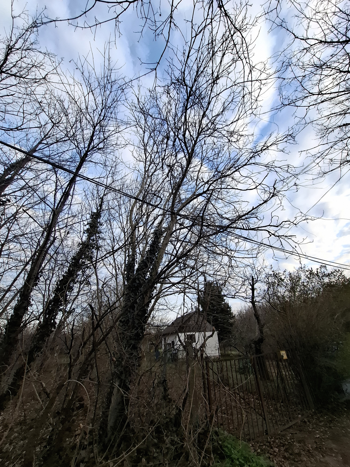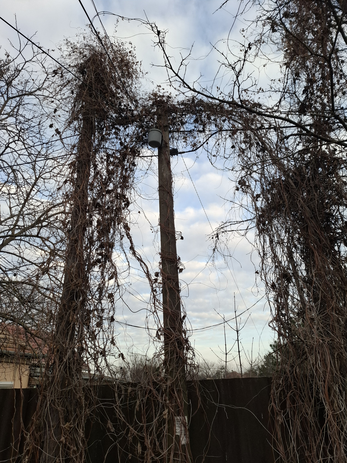 A Katlan utca 12-14 környékén a növényzet a távközlési oszlopokat felkúsztak a futónövények és a fák is ránőttek a vezetékekre. Valószínűleg távközlési vezetékek.