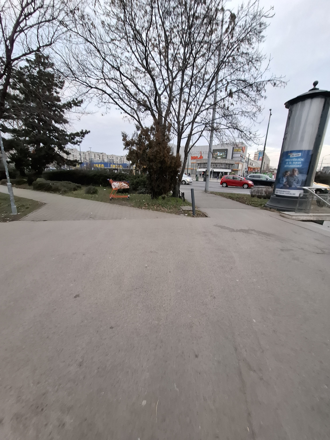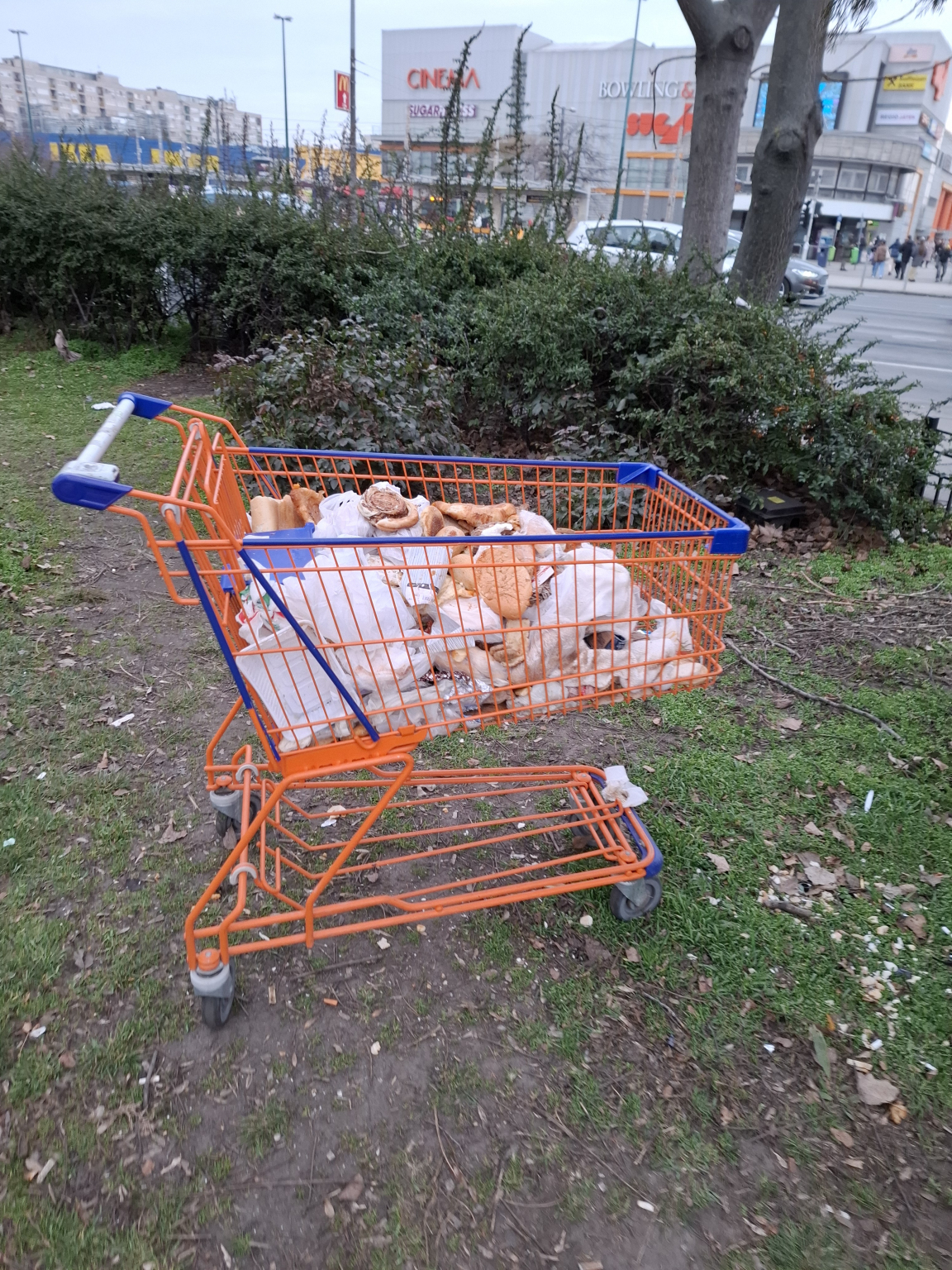 Sok kidobott pékárú található egy bevásárlókocsiban az Örs vezér tere aluljáró E kijárat mellett.