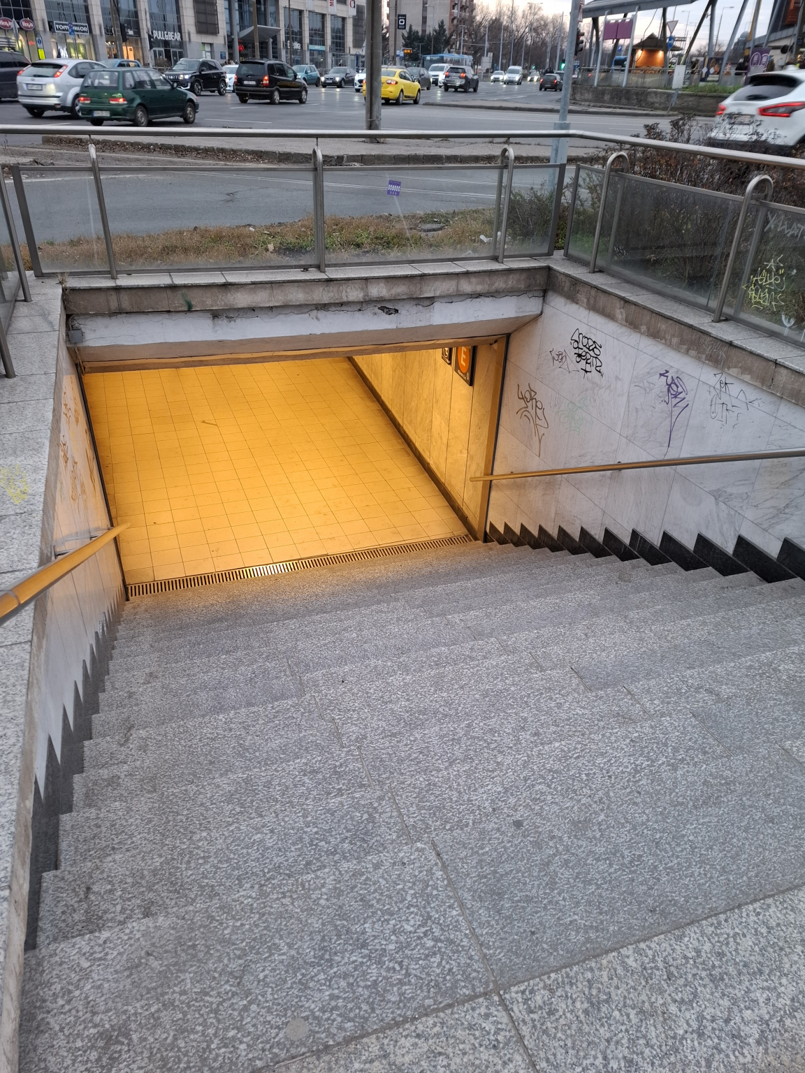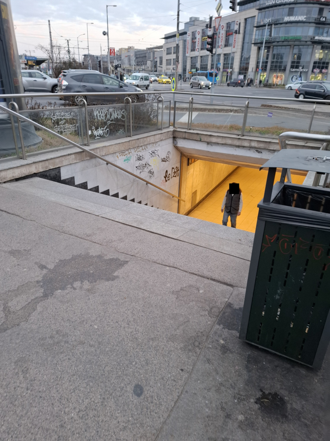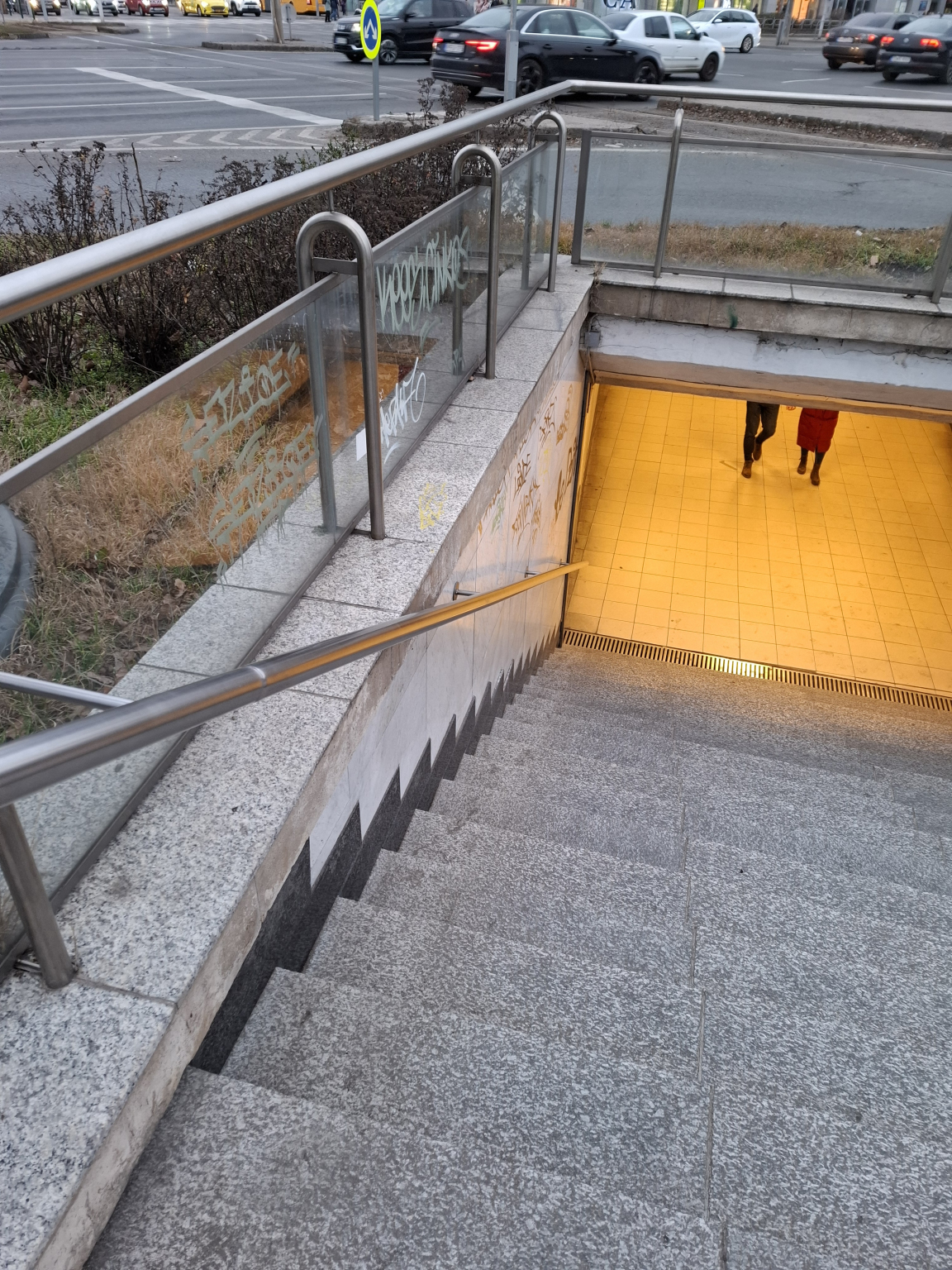 Az Örs vezér tere aluljáró E kijáratánál a csempék és az üvegfelület is le van fújva.