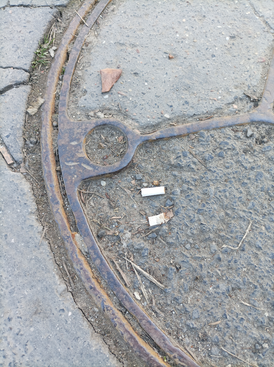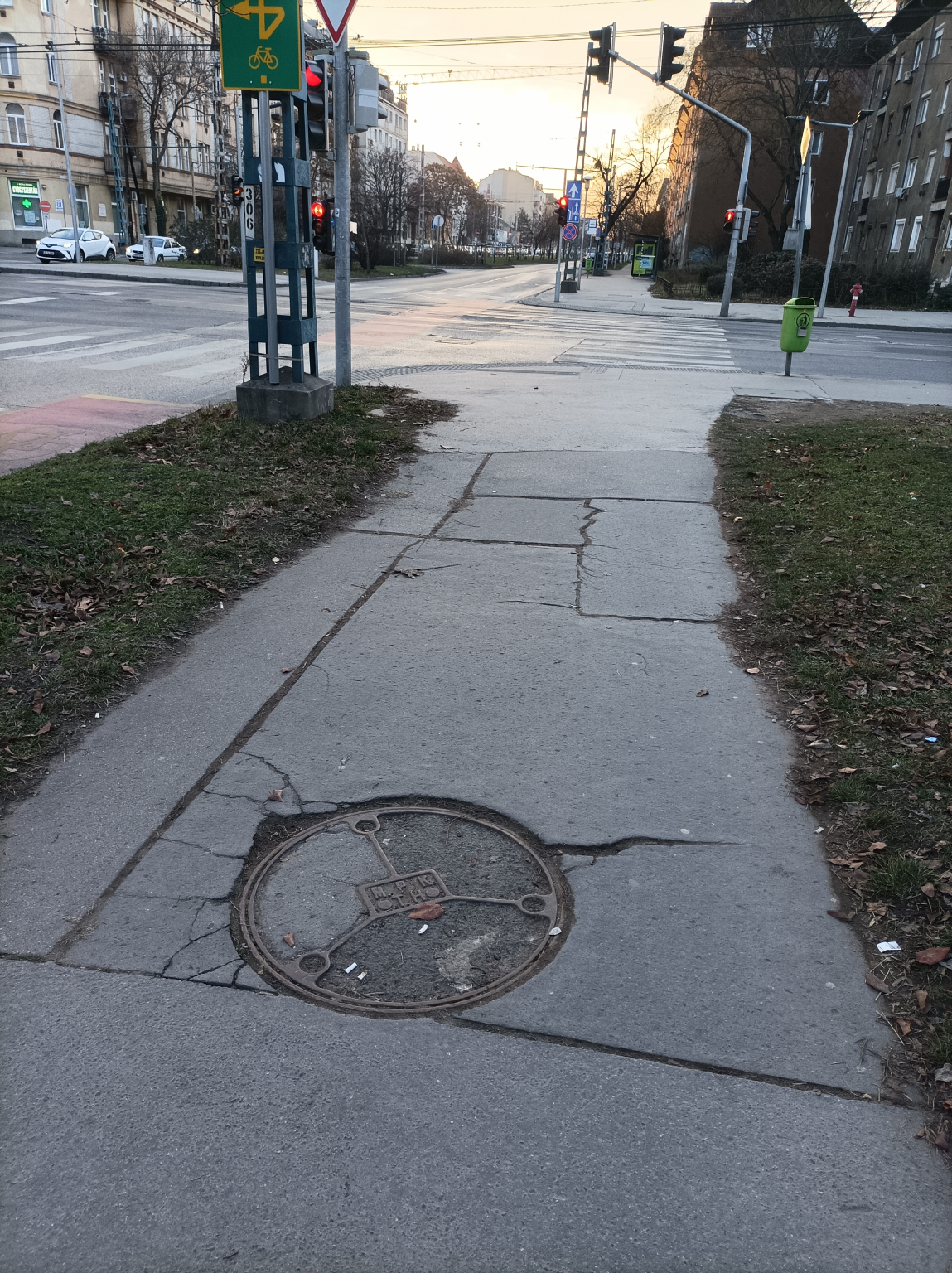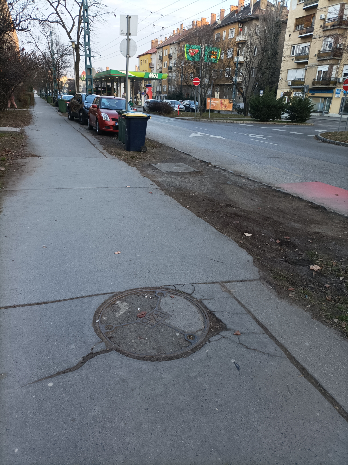 A Róna utca 158 előtt a fedlapból elkezdett kikopni az aszfaltréteg. Kavicsos a felülete.