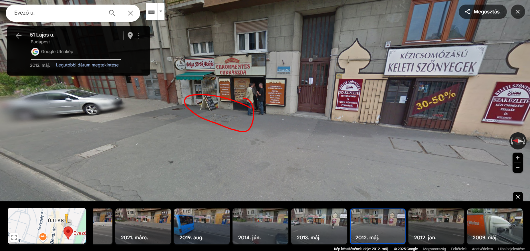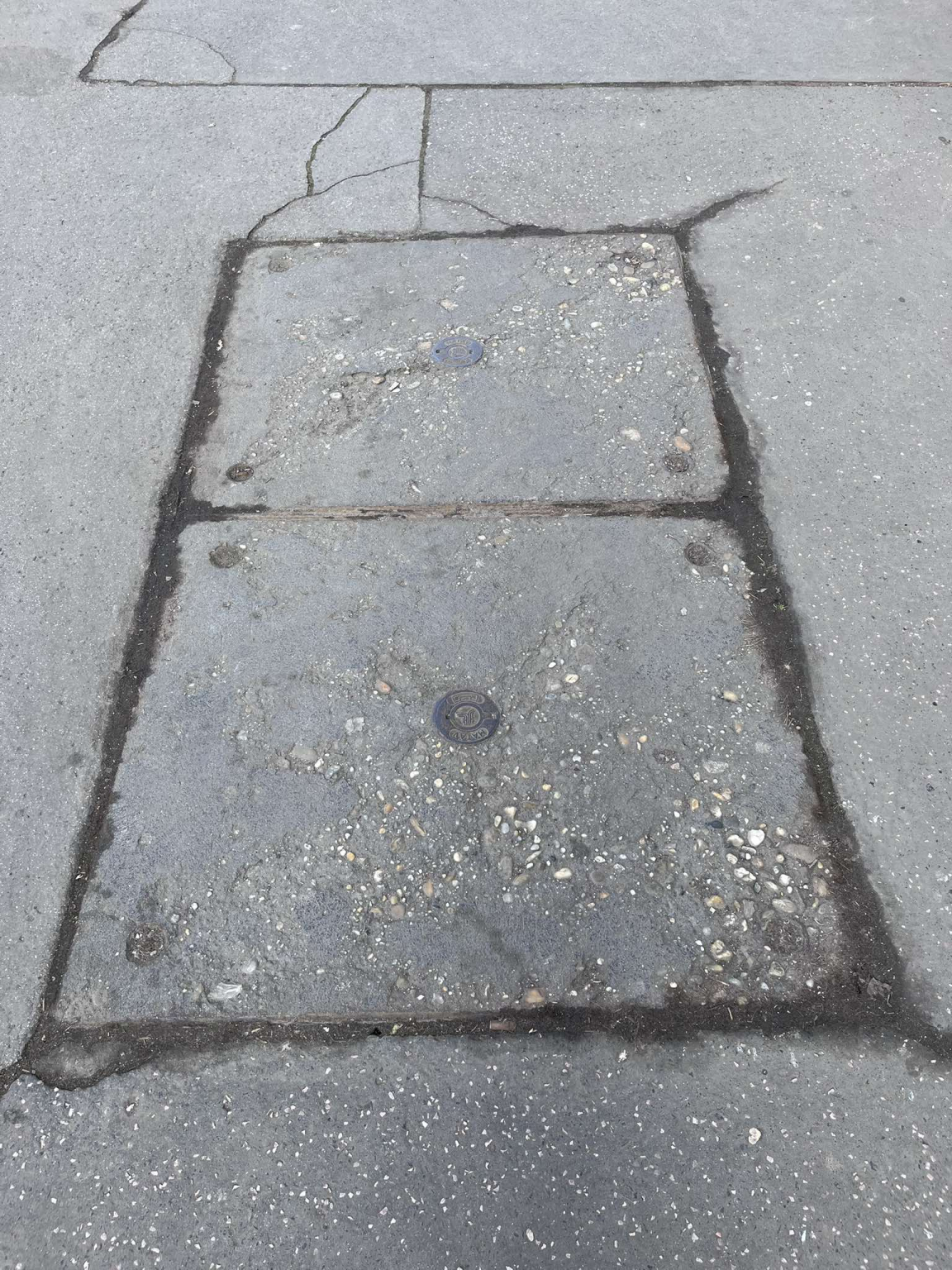 Kopórétegét vesztett telekomos fedlapok pont a cukrászda bejárata előtt.