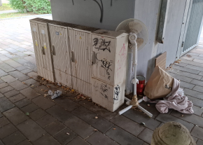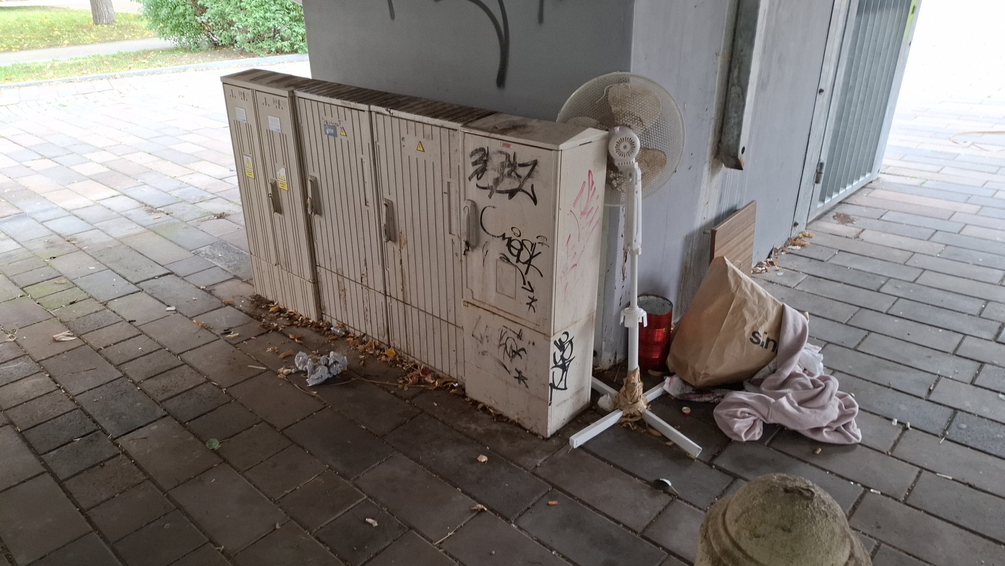 Úgy látszik a "probléma" pillérről pillérre vándorol. Vélelmezhetően újra emberi ürülék van, most egy másik pillérnél, illetve az előtte lévő elektromos (?) szekrényen. Ne feletkezzünk meg a graffitiről sem.