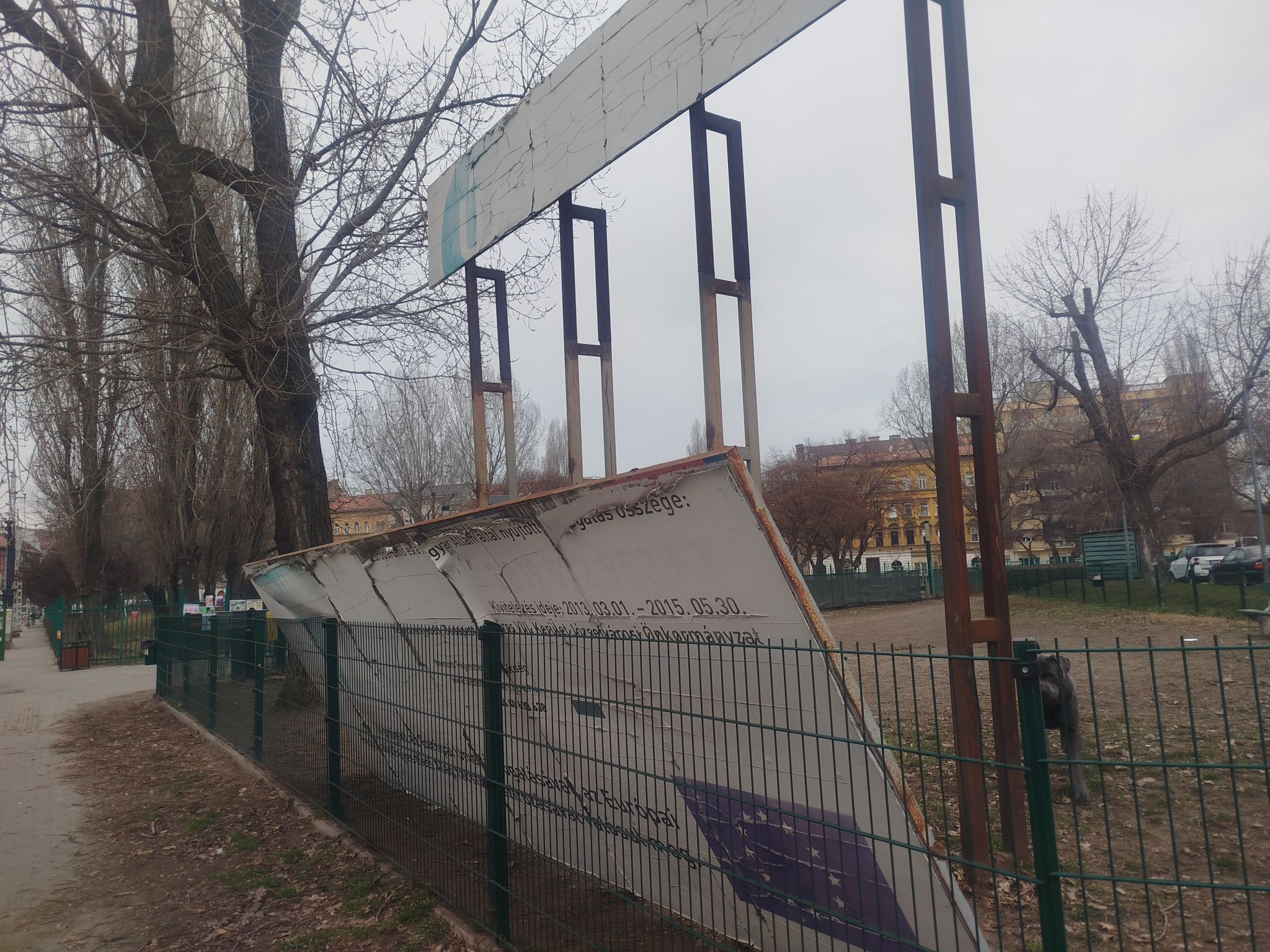 Ahogy a képen látható. Korábban már kértem a tábla lebontását, remélem ezt végzik, ha nem, akkor ismét kérem. Teleki László téri kisebb kutyafuttatónál.