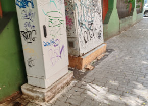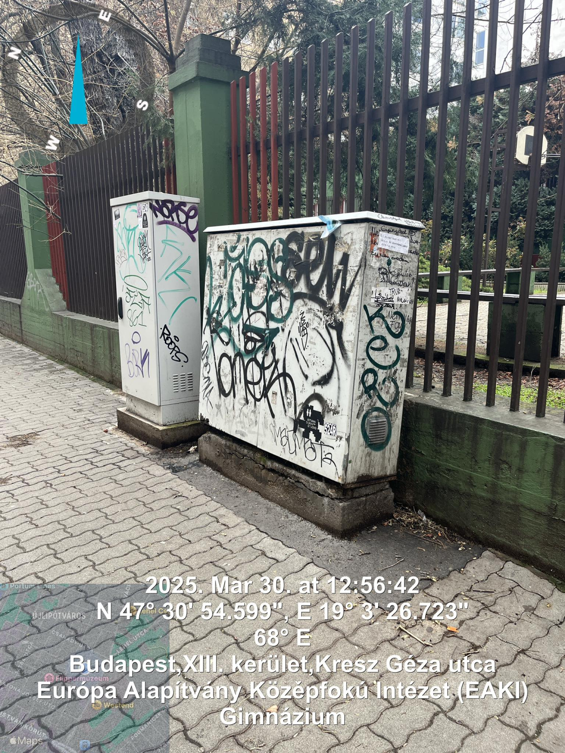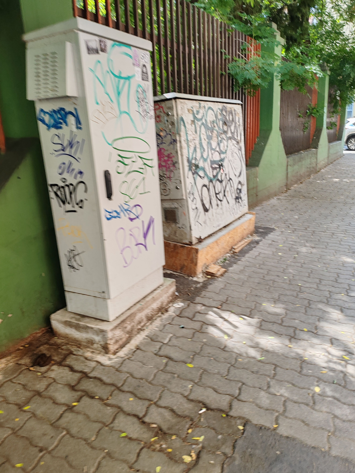Szétrohadt talapzatú közműszekrény , most még a kerítés felé dől.