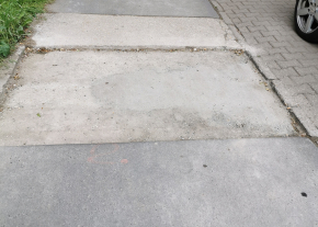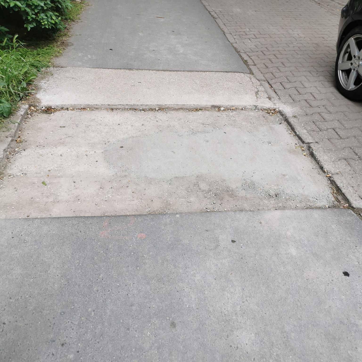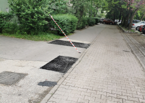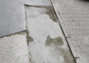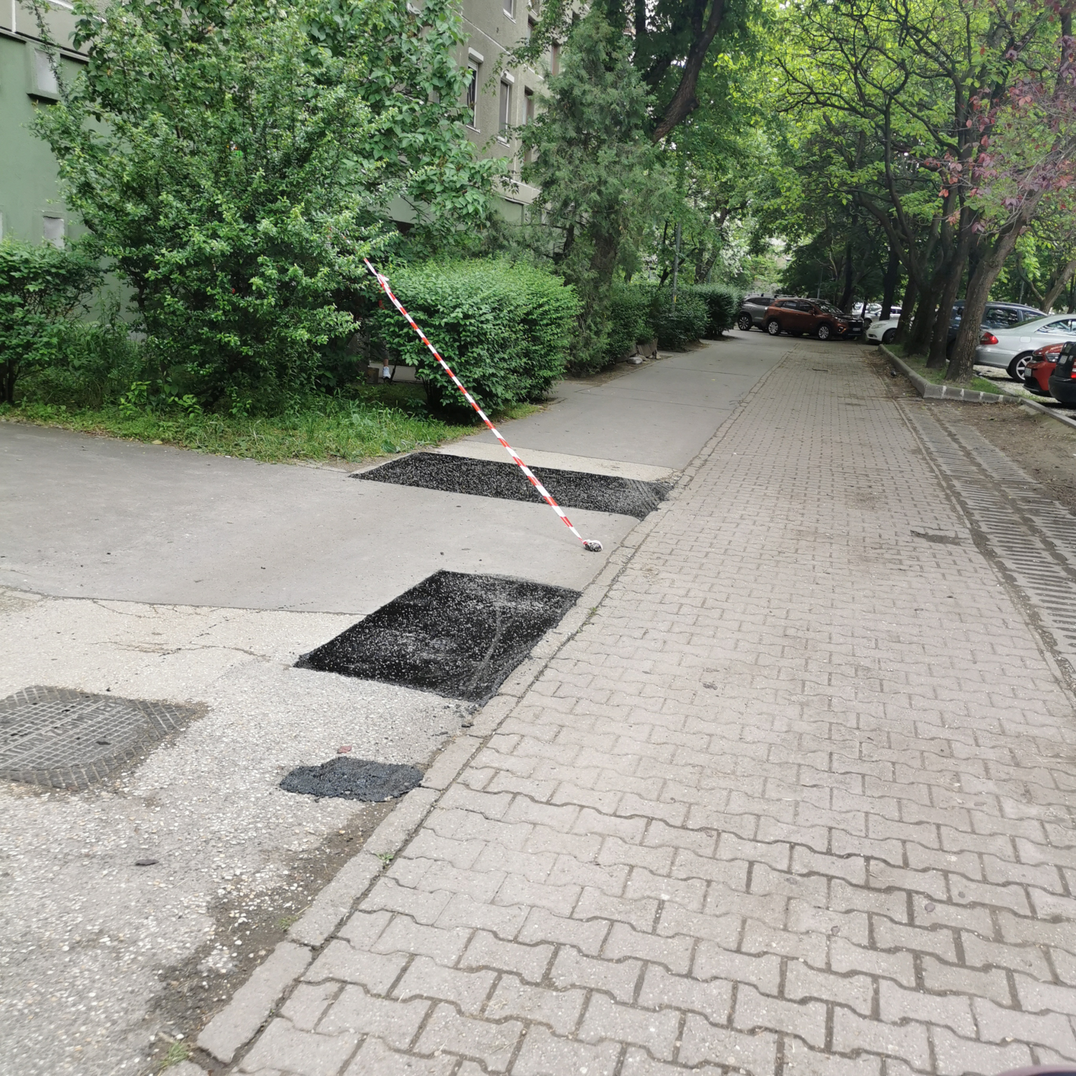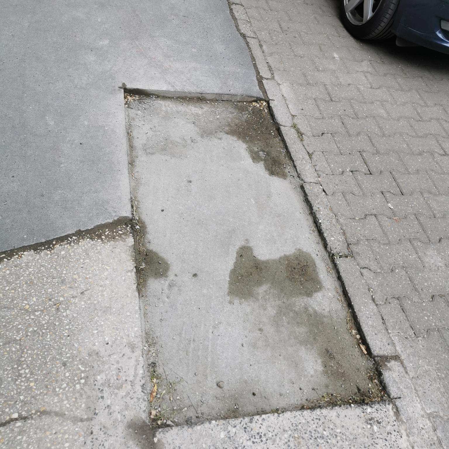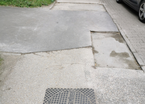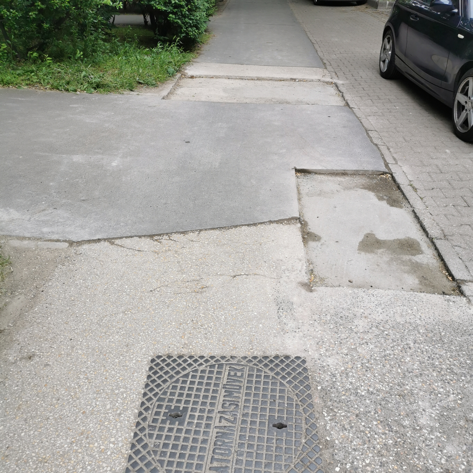 A mellékelt fotón látható, autók által is használt járdaszakaszon nagy kátyú nehezíti az áthaladást.