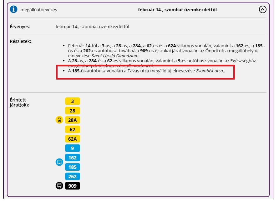 Felvetése alapján megvizsgáltuk a Tavas utca megállóhely Zsombék utcára történő átnevezésének lehetőségét, a változtatást Társaságunk részéről alapvetően támogathatónak tartjuk.”