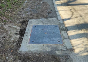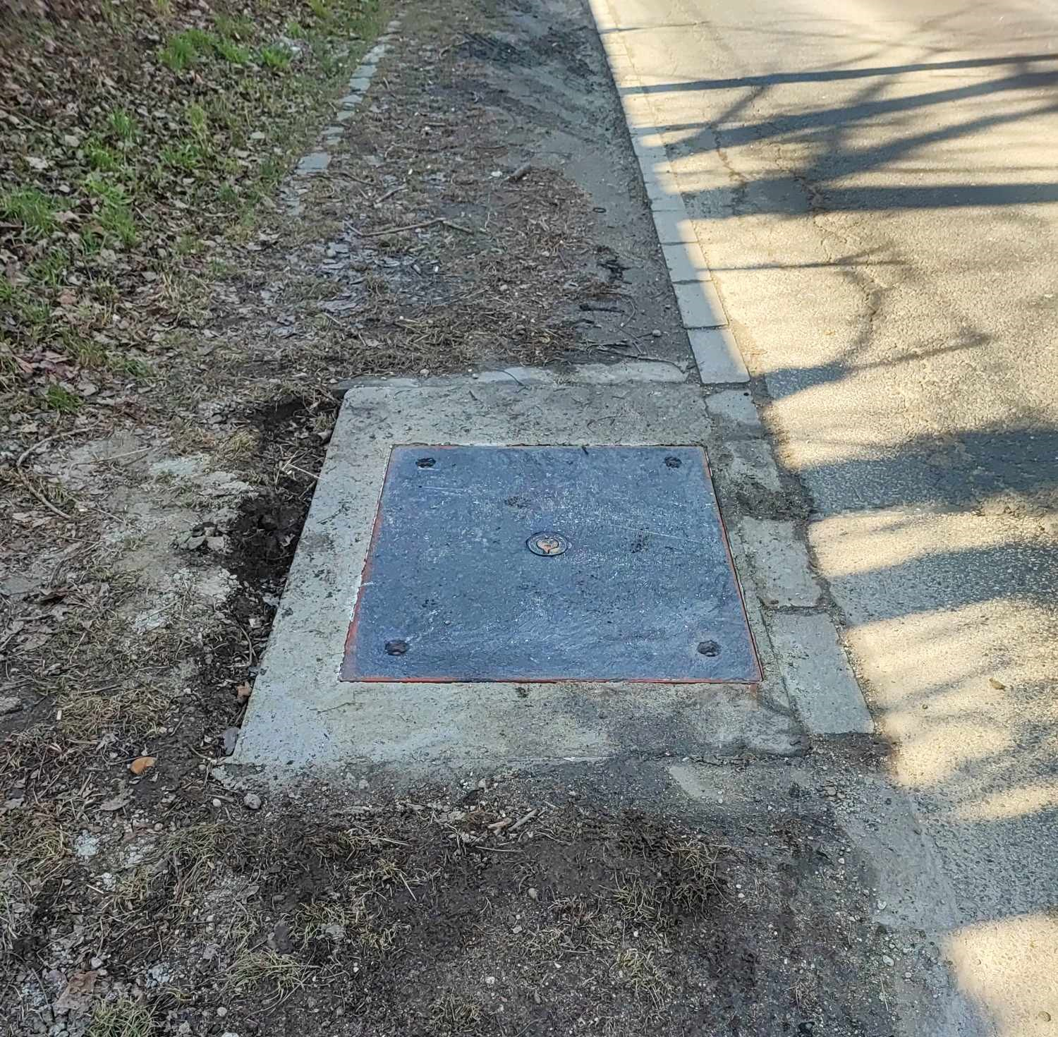 Megbillent Telekomos fedlap az út szélén a Jászberényi 90 szemben