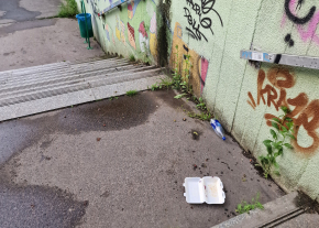 Kelenföld régi aluljáró Őrmező felé vezető oldalán az egyik szemétgyűjtő edény szét van lapítva.