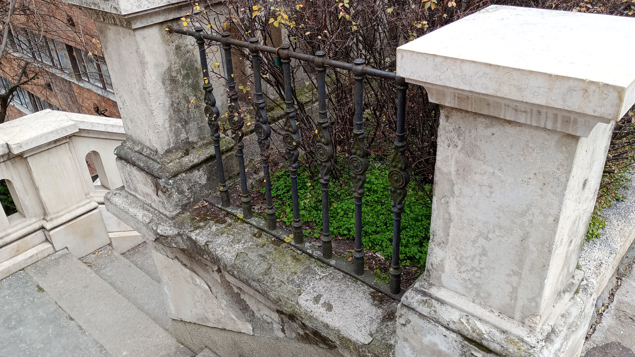 Turisták garmadája jár e csodás közterületi részlet csodájára Budavár kapujában, a Duna felől felfelé a Karmelita és a várkerület irányába, hol kolbászból van a kerítés is.
