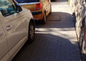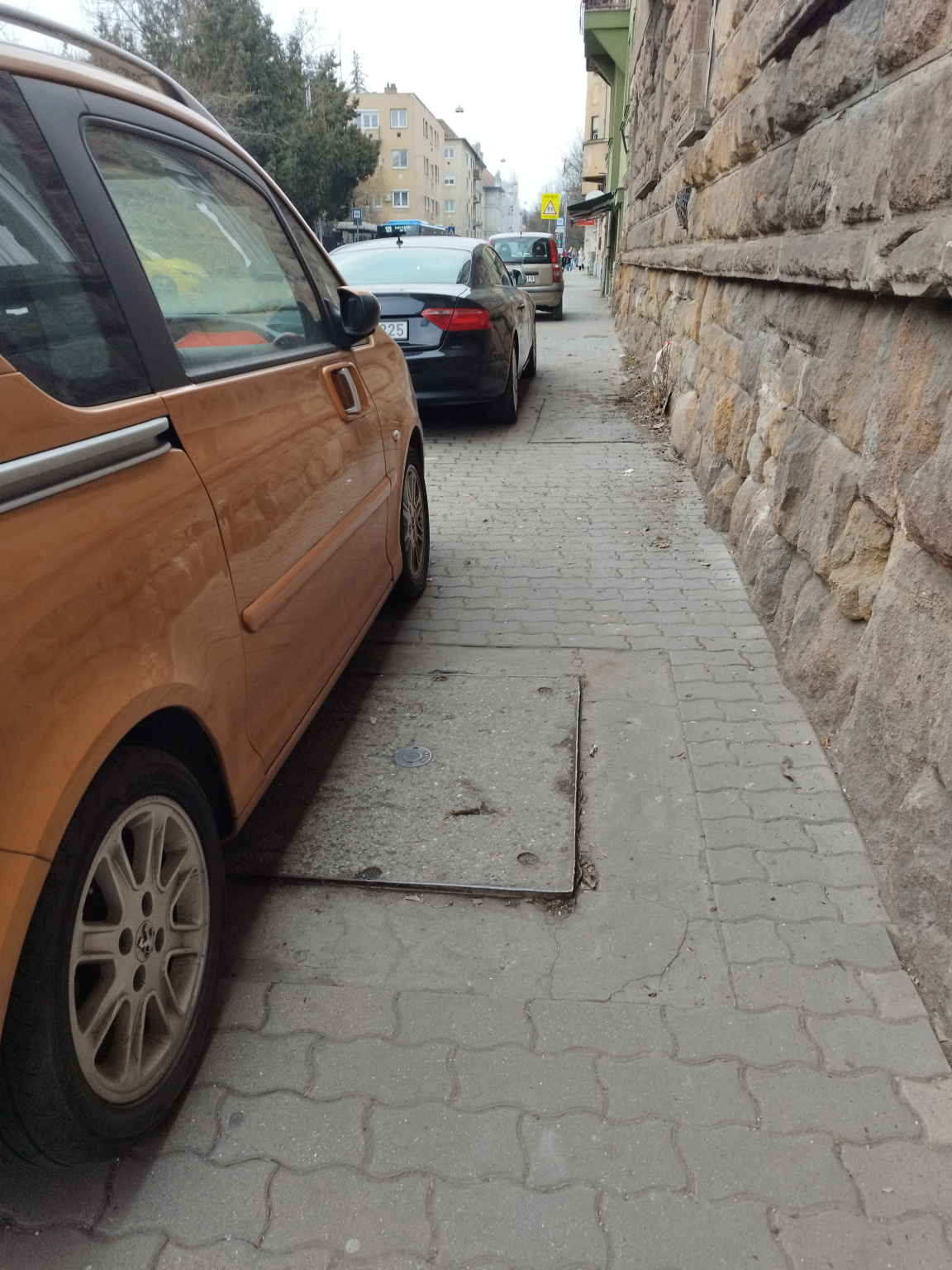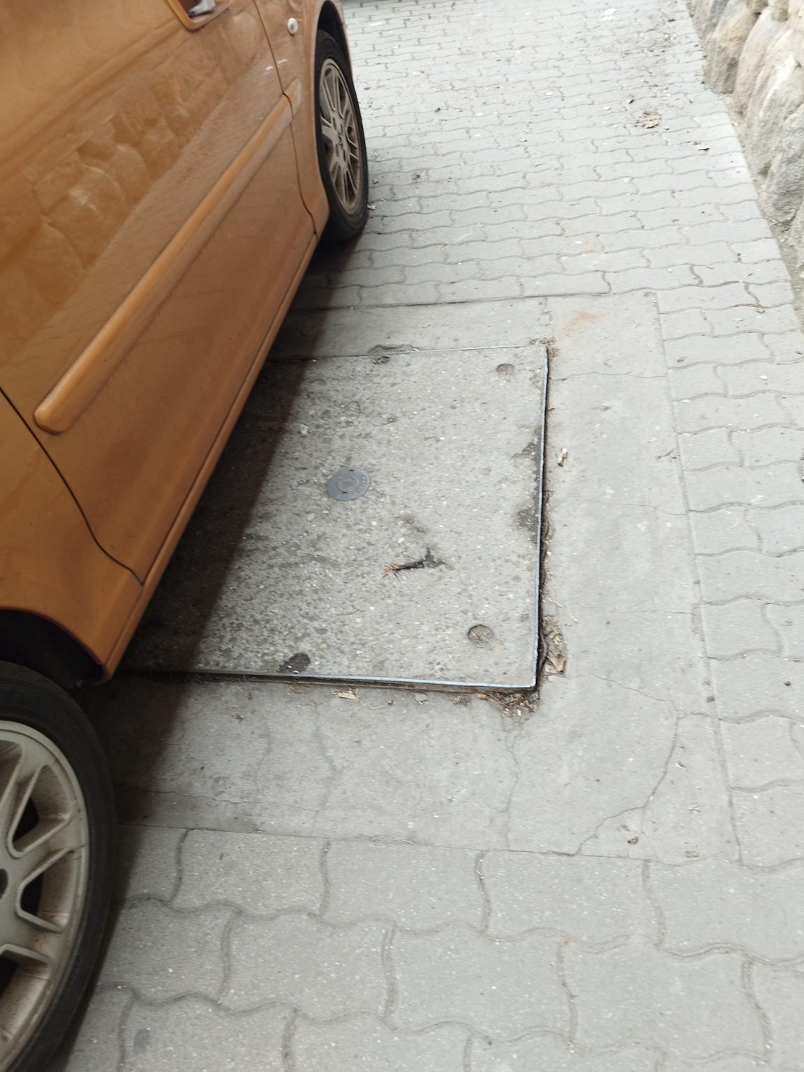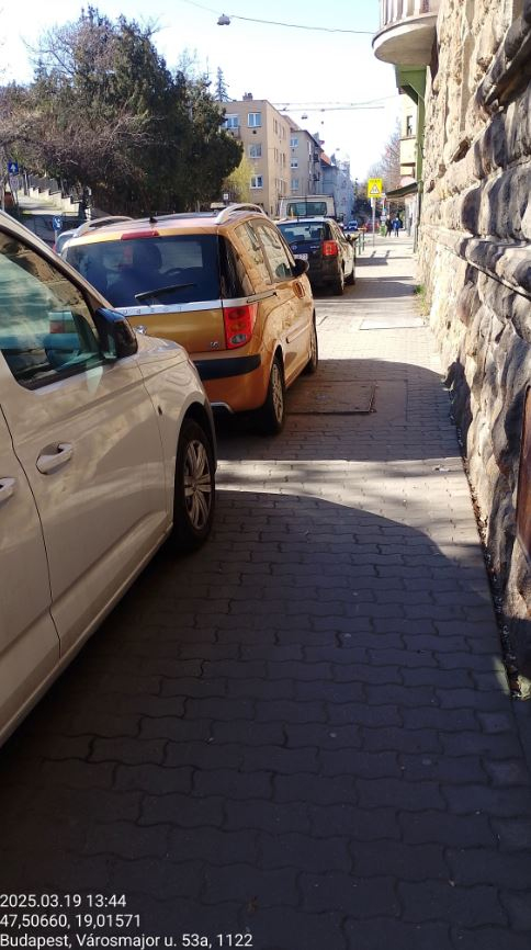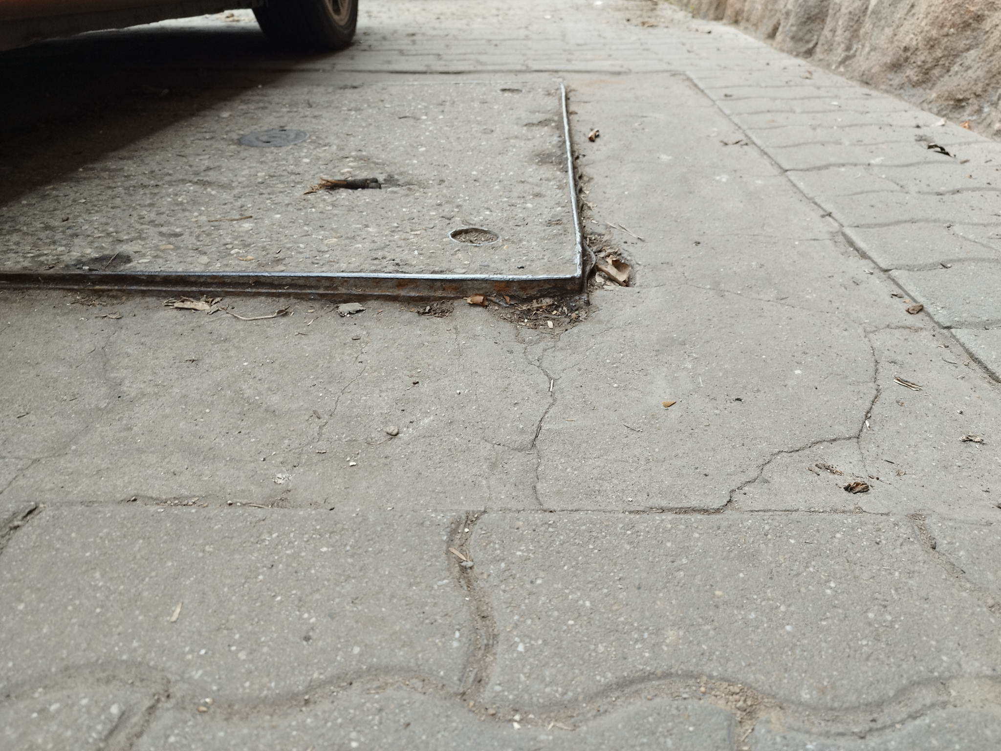 A Városmajor utca 55 előtt lévő Matáv feliratú fedlap sarka kiáll a járdából.