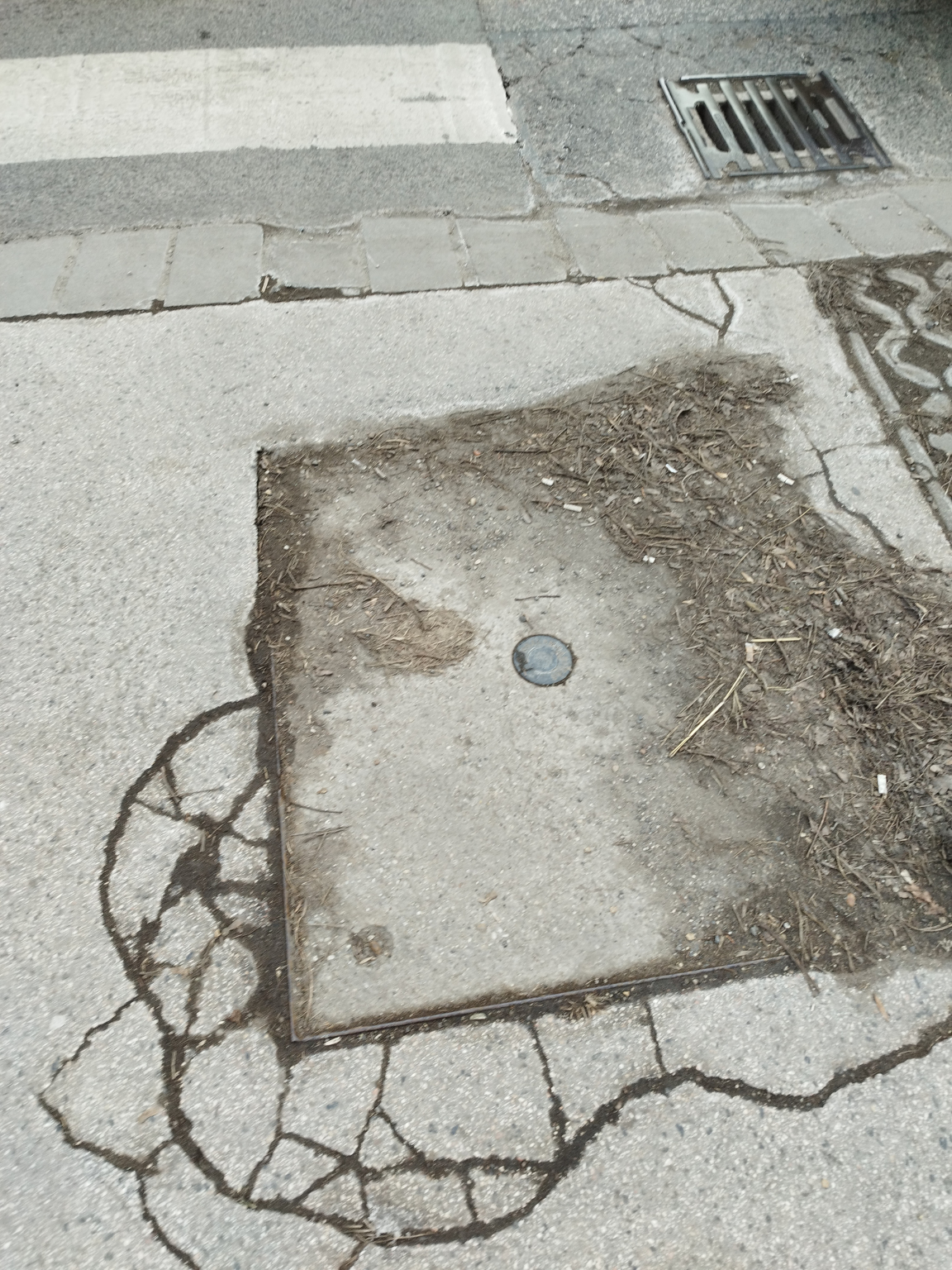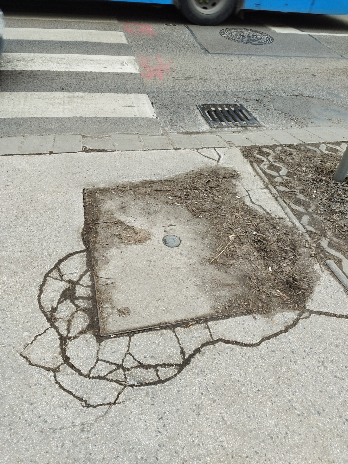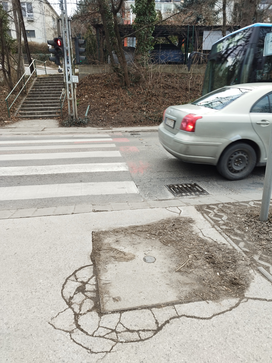A Városmajor utca - Pethényi út találkozásánál lévő gyalogátkelőnél lévő fedlap megsüllyedt és vele együtt a járda is szétrepedt.