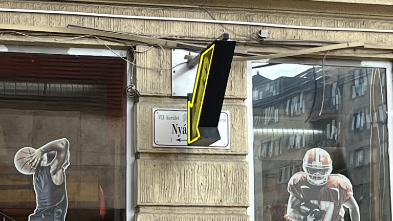 A Nyár utca és a Rákóczi út sarkán lévő vendéglátóipari egység cégtáblája teljesen eltakarja az utcanévtáblát. Ez így biztosan nem szabályos.