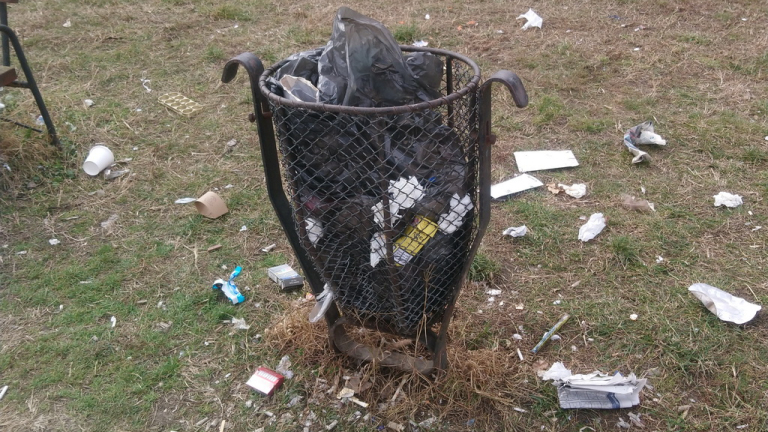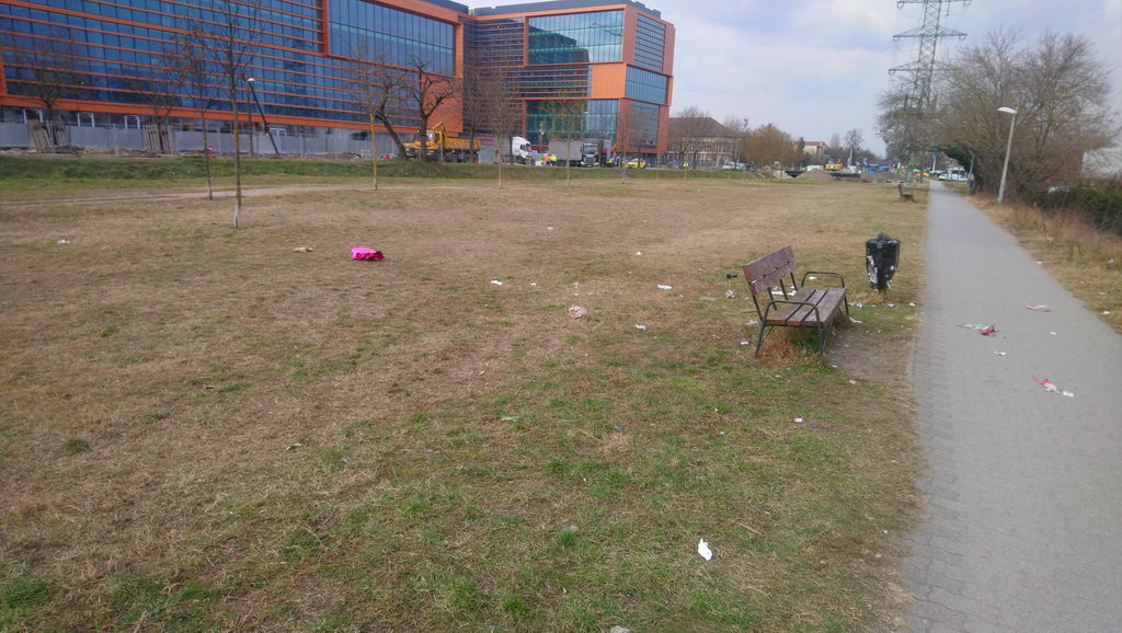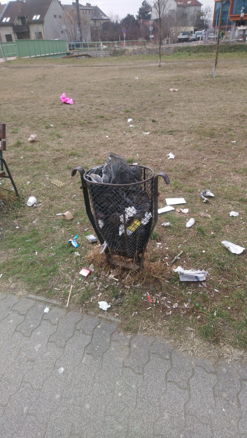 A Rákospatak parton (nincs neve a közterületnek) van egy szemeteskosár, amit nagyon régen nem ürítettek. Pár napja (akkro nem volt nálam fotózásra alkalmas eszköz) varjak cincálták szét az oda bedobott szemetes zacskókat. Azóta a szél is besegített nekik, a kosár környéke széthajigált szeméttel van tele.