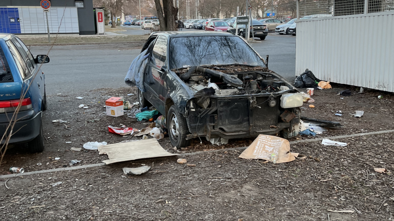 Elhagyott romos jármű, OMV kút mellett, GLS automatából szemben